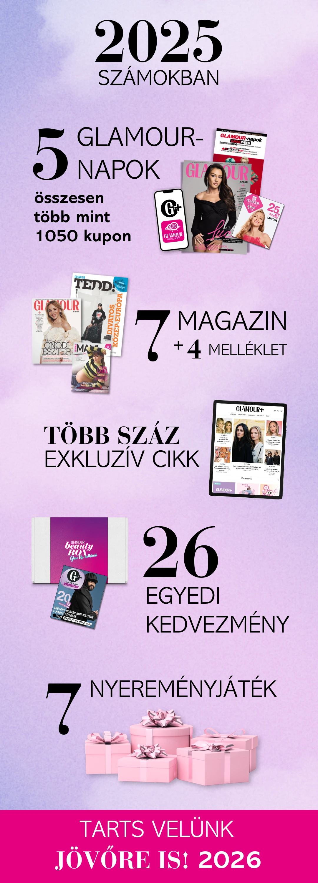A 2025-ös év egy emlékezetes időszak volt, tele rengeteg közös élménnyel és felejthetetlen pillanattal, amiket együtt éltünk át. Szívből örülünk, hogy részesei lehettünk ezeknek az eseményeknek, és hogy veletek oszthattuk meg őket! Szeretnénk számokban is kifejezni, hogy milyen sok dologgal ajándékozott meg minket a GLAMOUR Plusz a 2025-ös esztendőben.