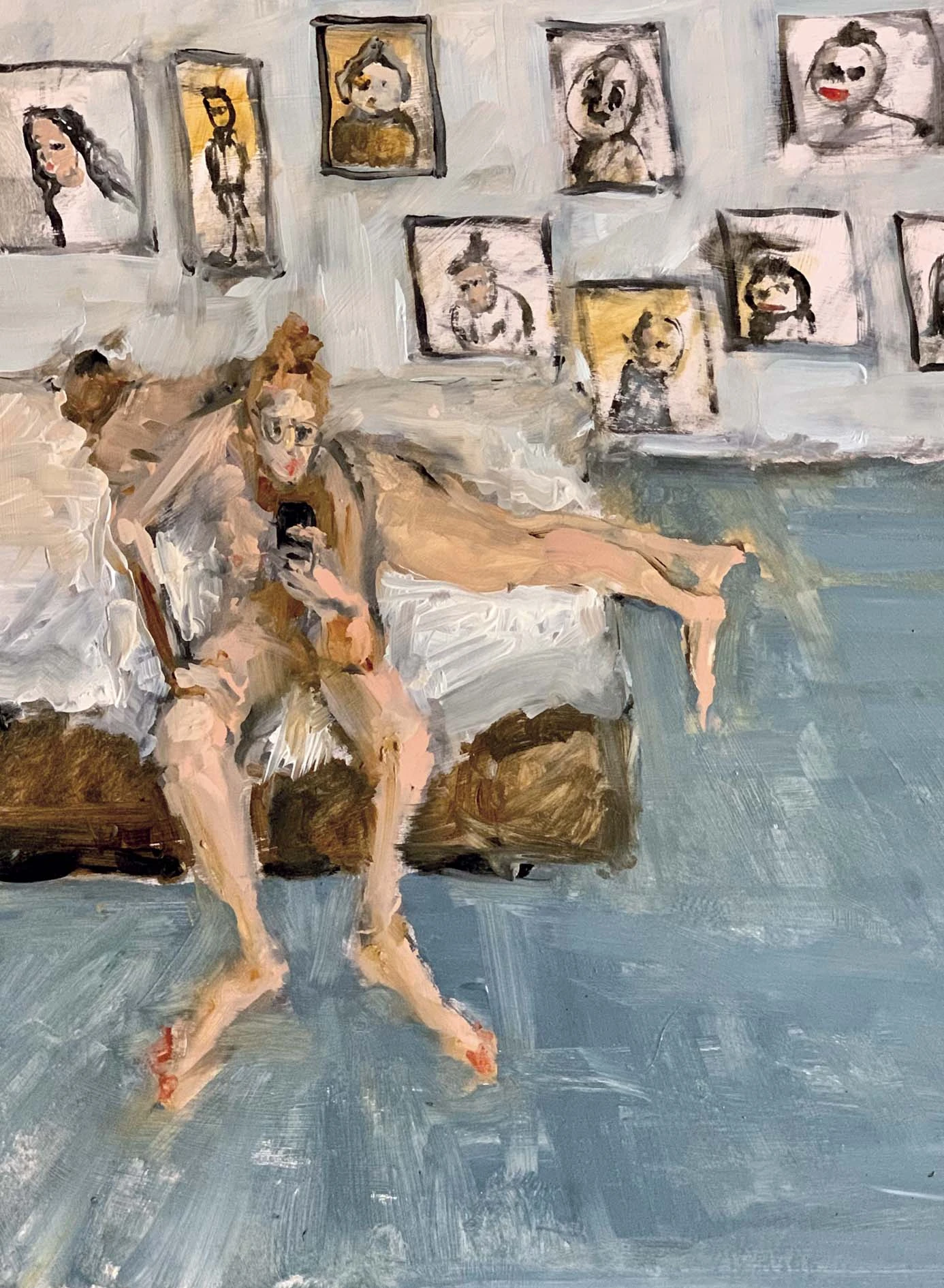 Arra, hogy áradó életszeretet van a képein, mély értése annak, hogy az élet furcsa, játékos, őrült és szabálytalan. És számomra árad róluk az is, hogy rendben van önmagával, tudja, hogy kicsoda, és hogy a sokféleképpen élhető életek közül, amikbe minden belefér, az övé, ilyen. Birtokolja, belakja, érzi, érti, éli. Ettől magabiztosságot sugároznak a képei, olyan nőt érzek mögöttük, aki stabil, tisztában van önmagával, és azzal, hogyan szeret lenni. Ezzel párhuzamosan a képein a figurák elnyúlóak, eltorzultak, groteszkek, mintha harag és düh is lenne önmagával szemben, egy kis nemszeretés.