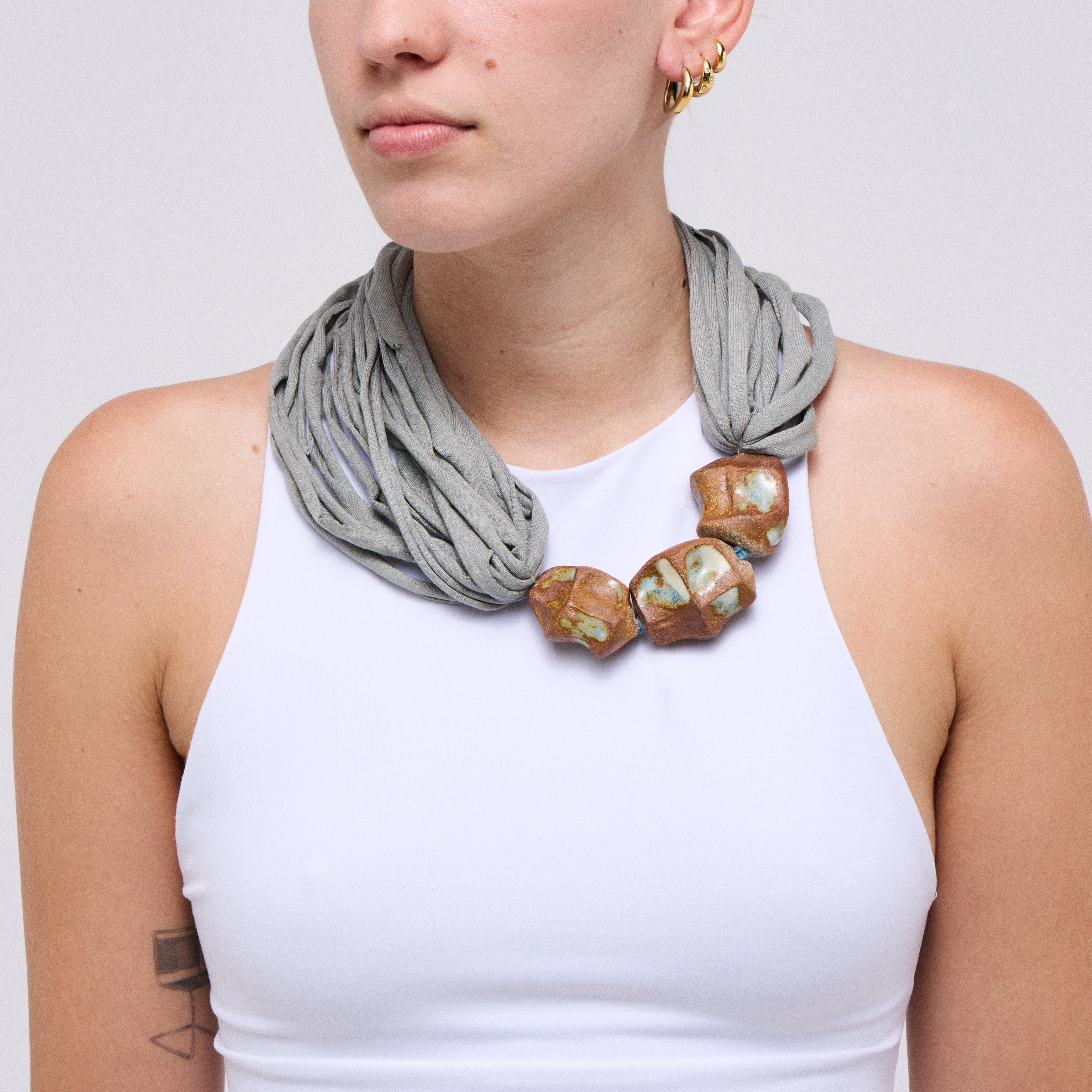 A nyaklánc egy picit más történet: ebben az esetben inkább az ujjaim és az agyaggal vagy a porcelánnal való kapcsolaton van a hangsúly! Mindig is nagyon érdekelt a divatvilág (diákként dolgoztam is egy ideig a szakmában, még Párizsban), az érdeklődésemet pedig ezekben a nyakláncokban élem ki! Emellett tetszik az az elgondolás, hogy hordhatóvá tegyük a kerámiát: ez egy újfajta kapcsolódást tesz lehetővé az ember és az alkotás között.