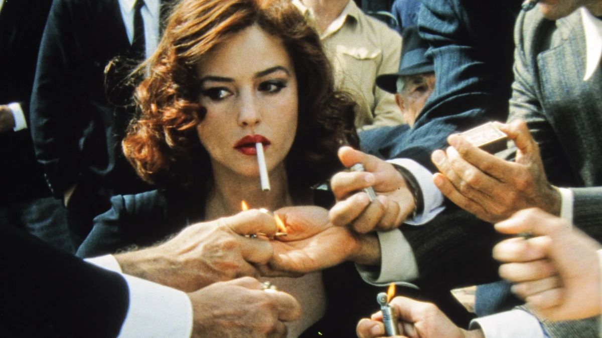 Renatóhoz hasonlóan tehetetlen dühtől forrongva figyeljük, amint Malèna levágja hosszú fekete fürtjeit, majd vörösre festett hajjal és ajkakkal jelenik meg a közismert jelenetben, amelyben fél tucat férfi kéz nyúl felé, hogy meggyújtsa a cigarettáját. Ez az első alkalom, hogy felemelt fővel, szemkontaktust tartva sétál végig a főtéren, az arcán legördülő könnycsepp azonban mindent elmond a fájdalmáról. A szépségét tartják az egyetlen értékének, és tényleg arra kényszerül, hogy kereskedjen vele.
