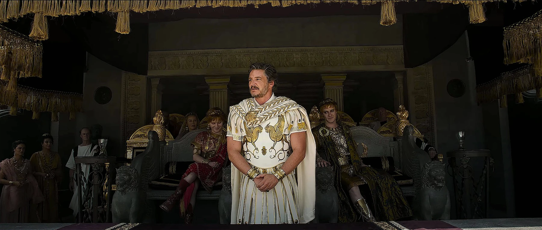 „Még soha nem volt ilyen élményben részem, és valószínűleg nem is lesz többé.” – meséli a Deadline magazinnak a történelmi akciófilm forgatásáról hozzátéve, hogy Ridley Scott zsenialitása abban rejlik, hogy vizuálisan komponálja meg az egész világot, és lenyűgözően realisztikus díszleteket építtet. Pedro Pascal szerint mindez a színészi játékot is megkönnyíti, hiszen az elméje elhiszi, hogy a helyszínen van: