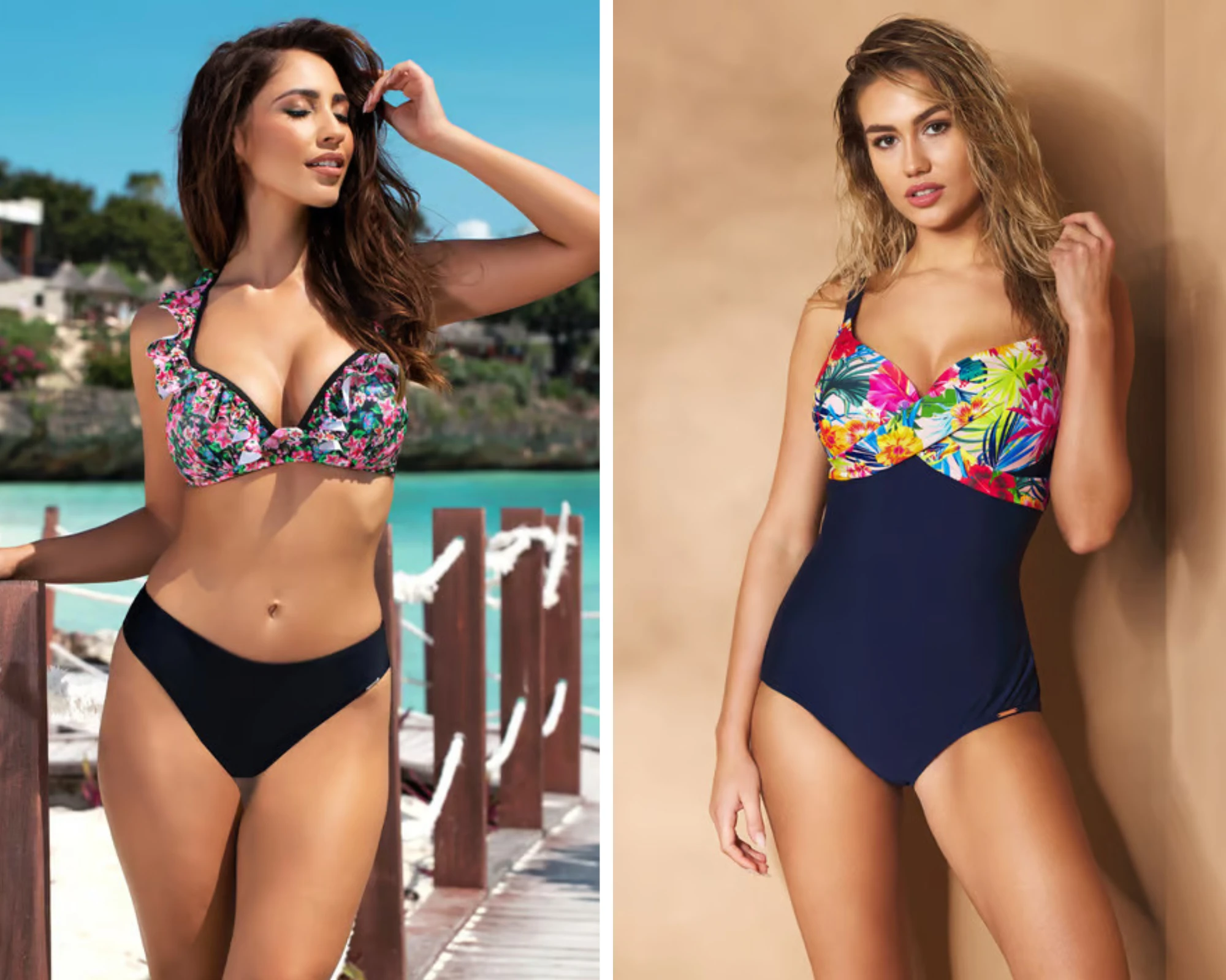 A kétrészes fürdőruhákat kedveled? Bátran kombinálj virágos vagy trópusi mintázatú bikini felsőket fekete, magasabb derekú alsókkal. A kis keblekhez push-up fürdőruhát ajánlunk feszes kosarakkal, a nagy keblekhez pedig az ellenállhatatlan bandeau stílusú felsőrészeket.