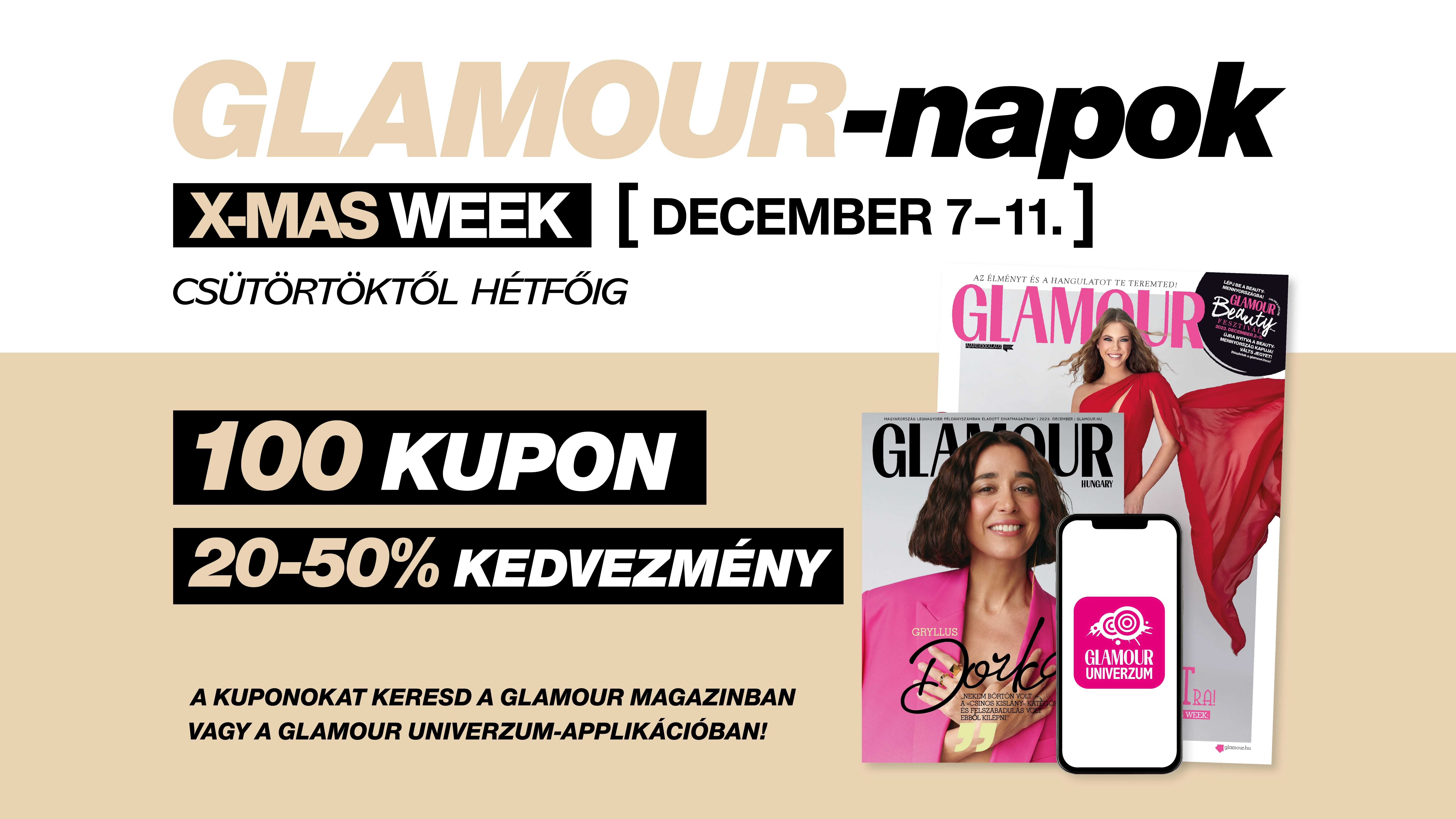 A karácsony nem a költekezésről szól, ezért ne engedd, hogy az ünnepi készülődés és az ajándékok beszerzése kifossza a pénztárcádat! Törekedj ezen időszak alatt is a tudatos vásárlásra, mi pedig segítünk, hogy kedvezményesen juss hozzá a kiválasztott meglepetésekhez: december 7-11. között a GLAMOUR-napok X-mas Week során 100 kupon lehet a tiéd, melyekkel 20-50% kedvezménnyel juthatsz hozzá számos szépségápolási-, háztartási termékhez, valamint szolgáltatáshoz, ruhadarabokhoz, kisebb háztartási gépekhez az üzletekben és online egyaránt!