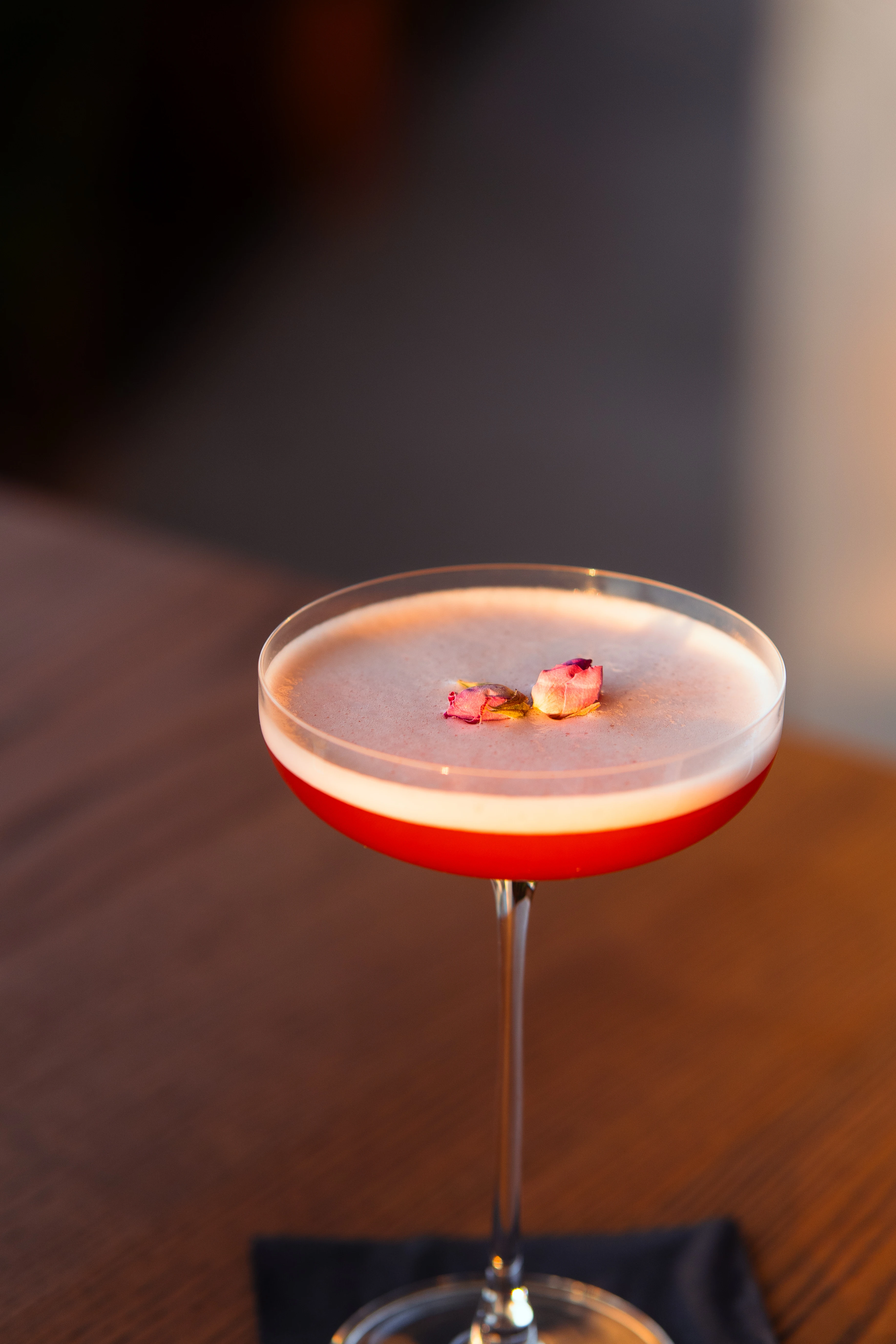 Hozzávalók: Puerto de Indias Strawberry gin, citromlé, cukorszirup, narancs bitter, rózsavíz, tojásfehérje vagy VeggWhite