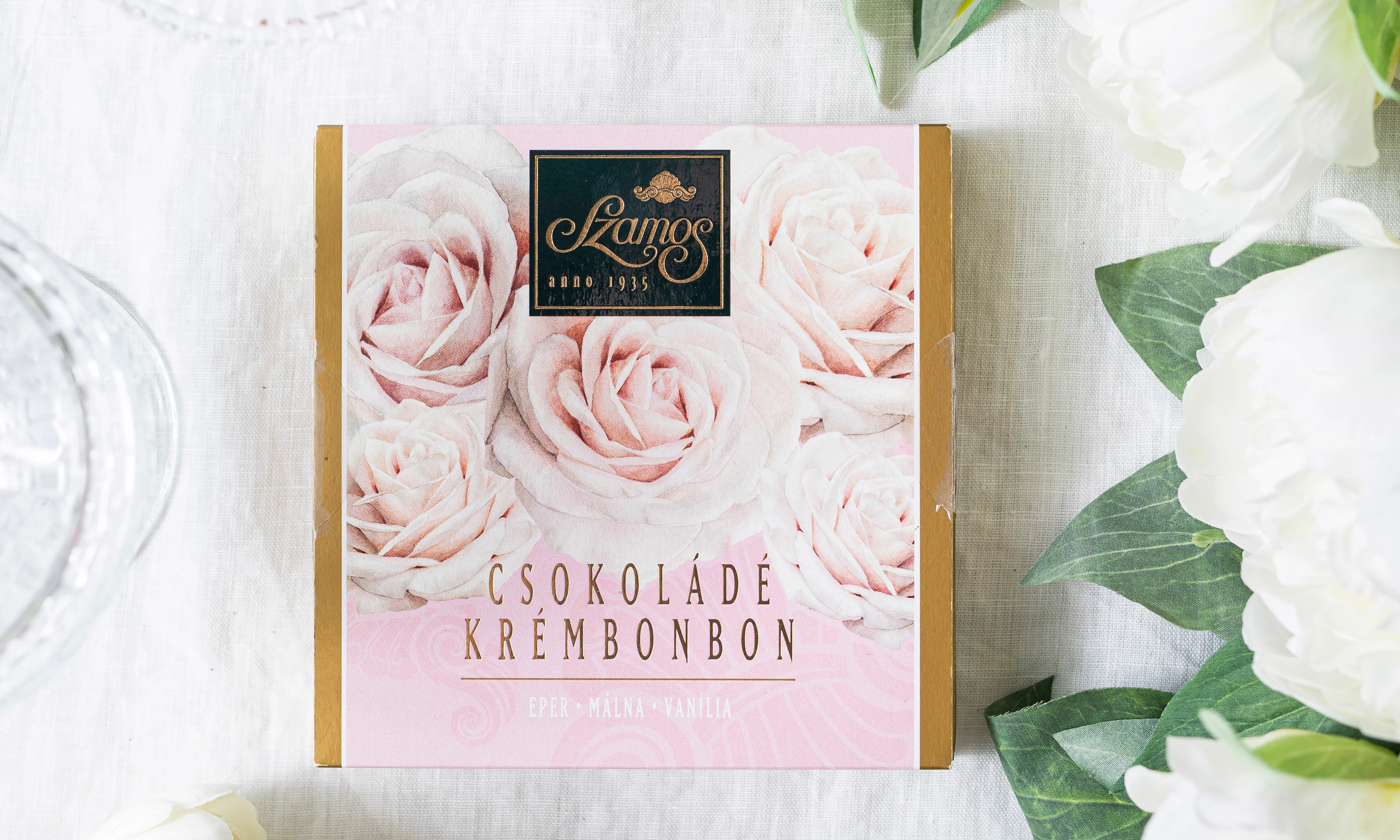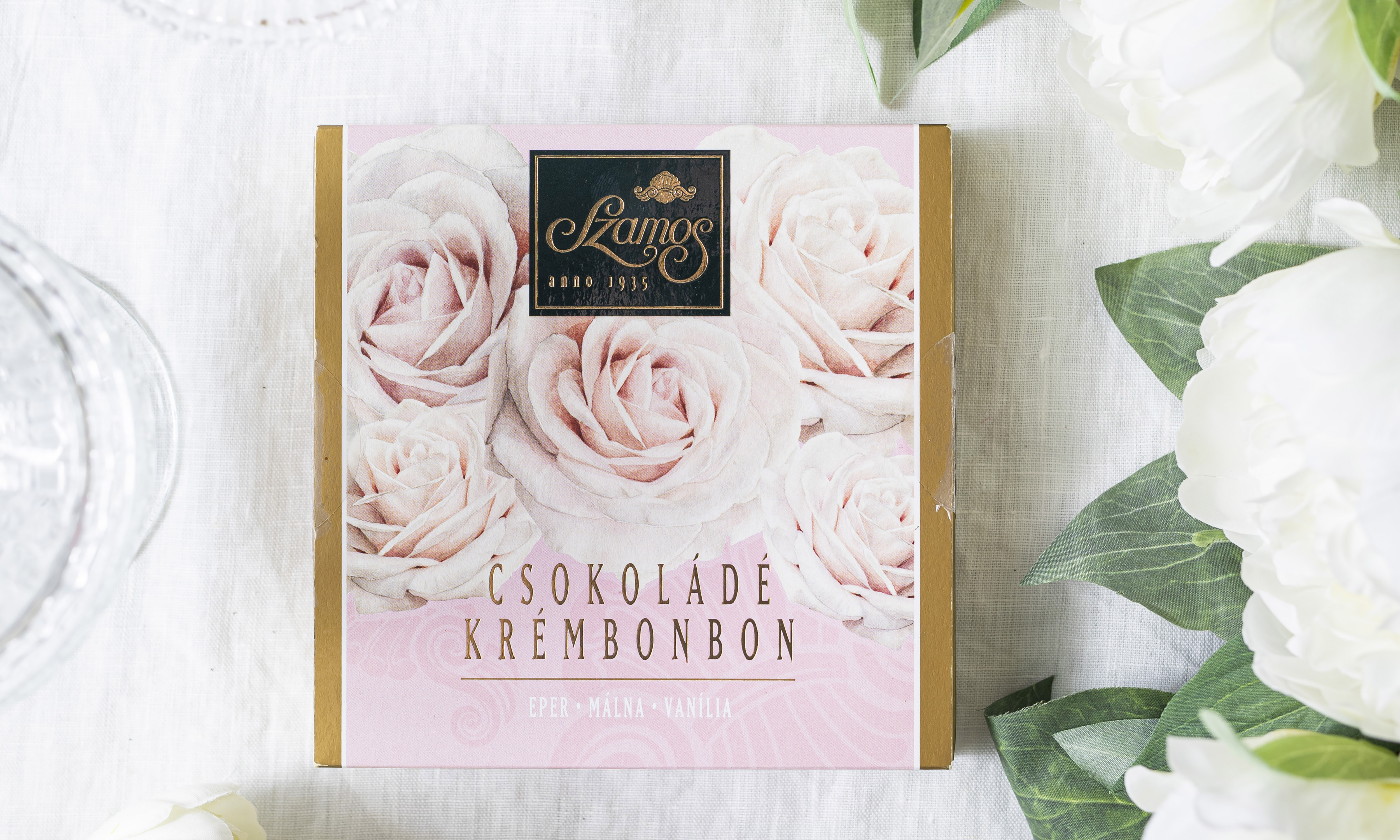 Csokirajongó anyukáknak ajánljuk púderszínű díszdobozunkat, mely epres, málnás és vaníliás krémmel töltött csokoládé krémbonbonokat rejt.