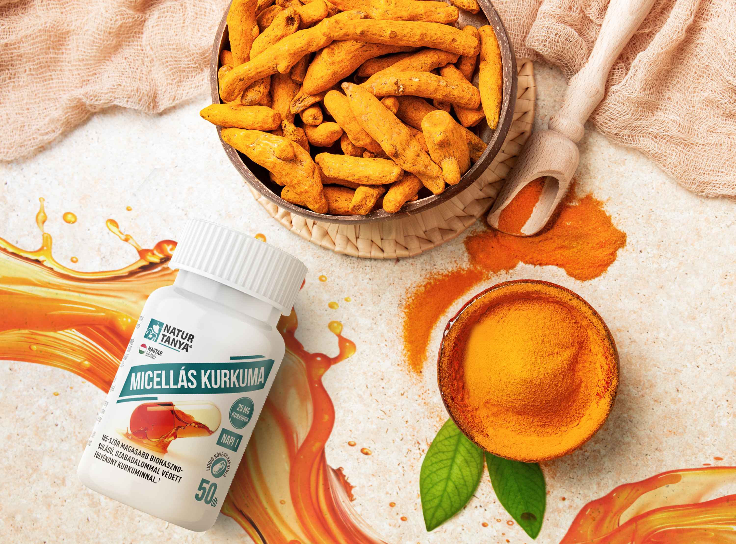 A Natur Tanya Micellás Kurkuma készítménye a tudomány és a természet találkozását kínálja egy kapszulában, amely a hagyományos kurkuma kivonattal (82% kurkumin tartalommal) összehasonlítva 185-ször jobb biohasznosulást biztosít. Emellett hozzáadott D-vitamint is tartalmaz, s így a D-vitamin és a kurkuma együttesen támogatják az immunrendszer és a csontok egészségét.