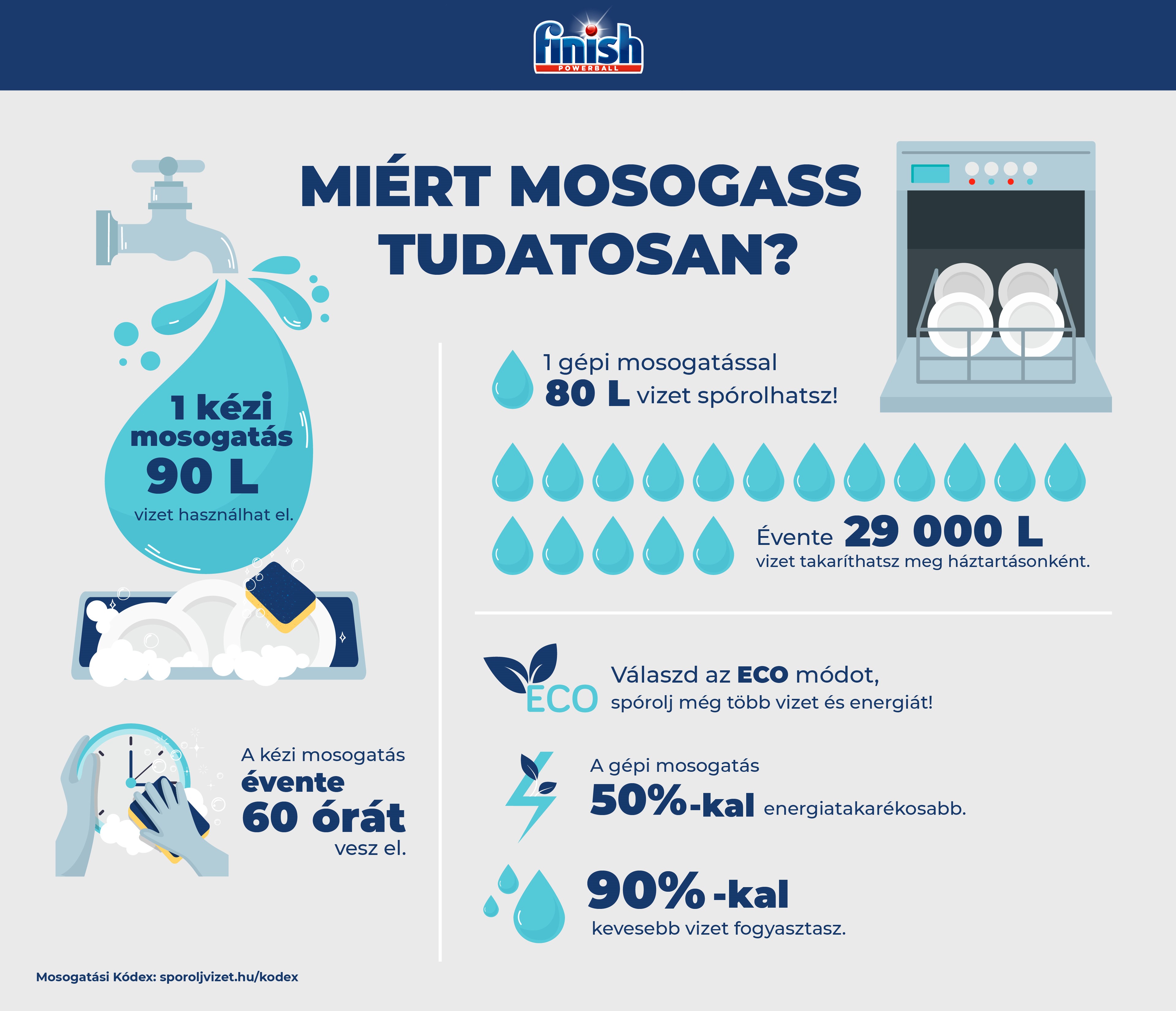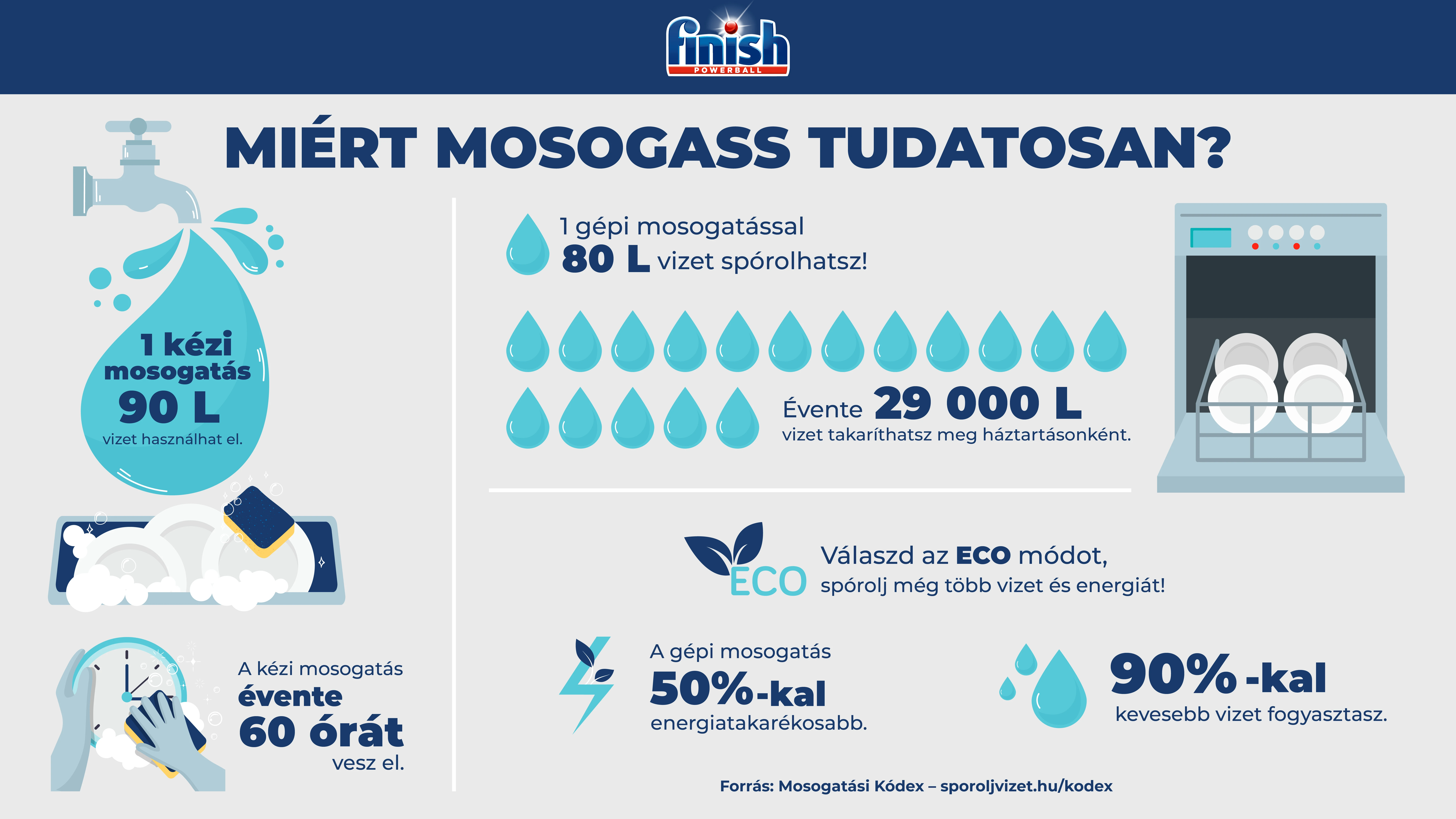 Nem titok, a takarékos vízhasználat egyik legkézenfekvőbb módja a mosogatási szokásaink újragondolása. Ha a vízkészleteink megóvása a tét, érdemes átböngészni az online elérhető Finish Mosogatási Kódexet, mert könnyen meglepődhetünk azon, hogy valójában már ma mennyi mindent tehetnénk az ügy érdekében.