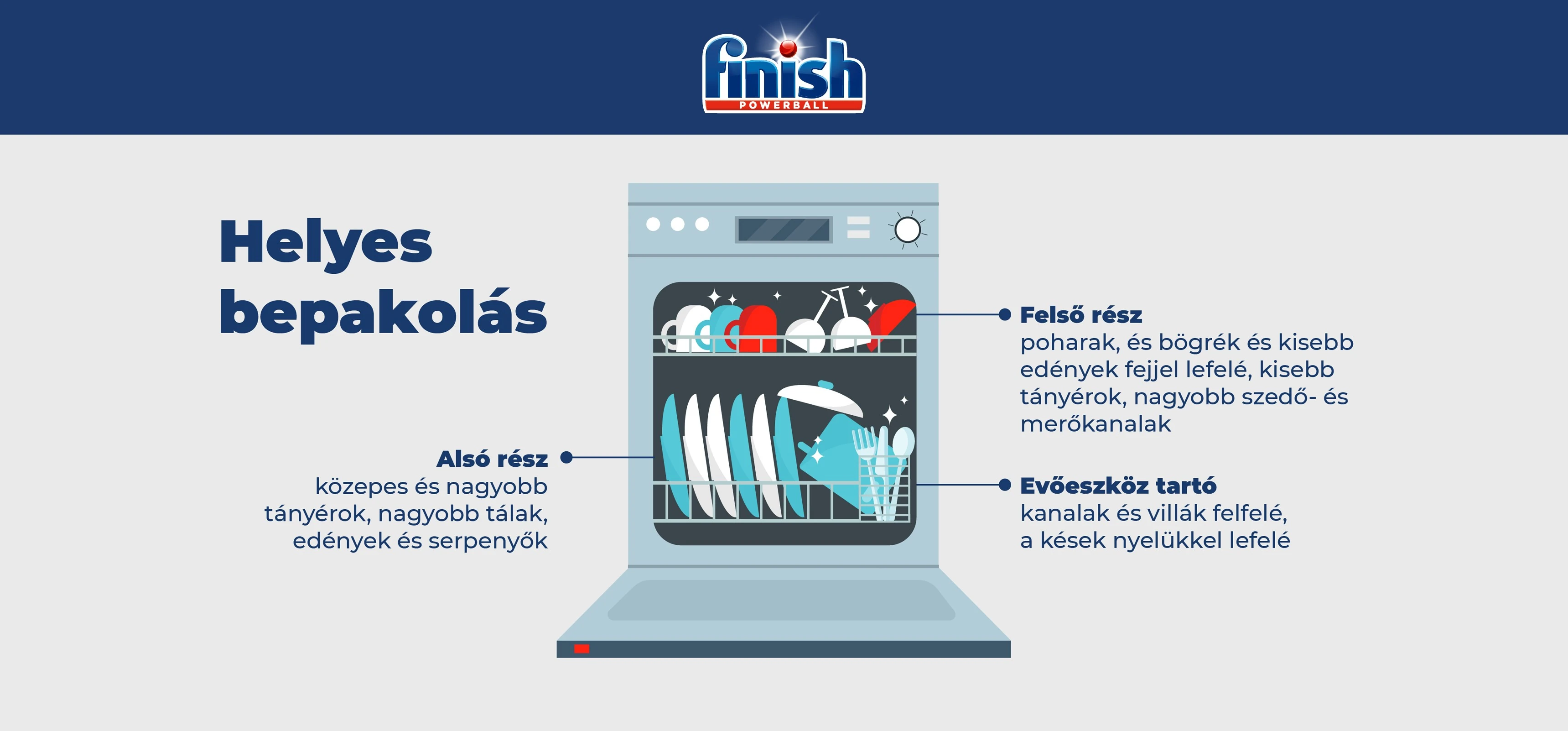 Ha a megtisztításban biztosra akarunk menni, fordítsuk inkább arra időt, hogy helyesen pakoljunk be a gépbe. A Finish Mosogatási Kódex számtalan tippje közül csak egy: a tányérok az alsó tálcán a mosogatógép belseje felé nézzenek, mert így lesznek a legtisztábbak!
