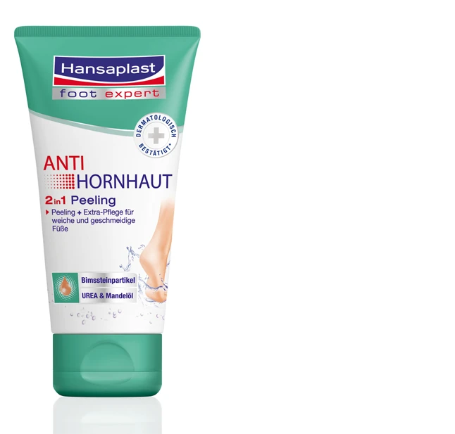 A Hansaplast INTENSIVE HELP 2in1 Bőrkeményedés elleni bőrradír hatása két szakaszból áll. A bőrradírozó hatású habkő-részecskék és természetes kősók gyengéden eltávolítják az elhalt hámsejteket. A mandulaolajat tartalmazó tápláló formula intenzíven ápol, így a láb simává és puhává válik.