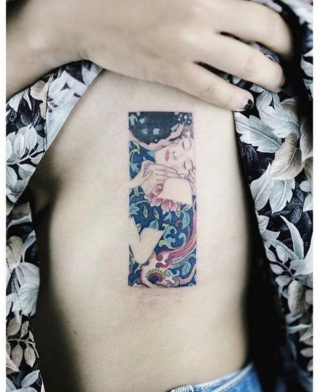 Nem ez az első Klimt-inspirálta tetoválás, azonban a különös színkombinációk még csodálatosabbá tették a világ leghíresebb csókját.
