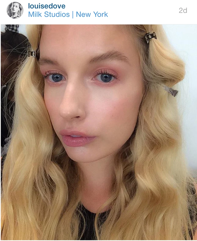 Ezután talán kicsit meglepő, de a sminkmester a Color Sensational rúzs Touch of Spice és Nude Embrace árnyalatát használta a modellek szemhéjára és az alsó szempillasora alá. Majd Egy dúsító szempillaspirállal tette látványossá a pillákat. Utóbbi lépés azért nélkülözhetetlen, mert a nagyon halovány szemhéjpúderek és krémek sápasztanak és a élettelenné teszik a tekintetet.