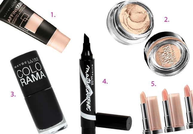 1: Affinimat mattító alapozó Maybelline 1999 Ft - 2: Color Tattoo 24hr szemhéjkrém Maybelline 2299 Ft - 3: Colorama körömlakk Maybelline 799 Ft/db - 4: Master Graphic szemhéjtus Maybelline 2149 Ft - 5: Color Sensational rúzs Maybelline 2299 Ft