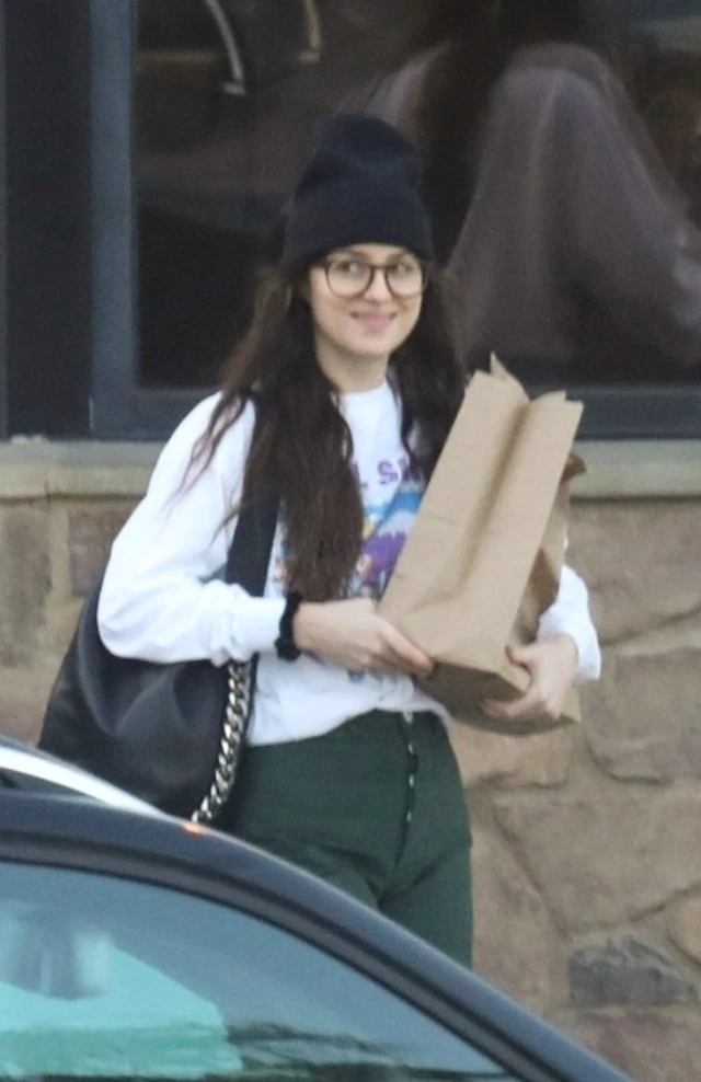 Dakota egy nagyon laza szettet viselt egyébként, fehér pulcsit, fekete manósapkát és egy sötétzöld nadrágot vett fel.