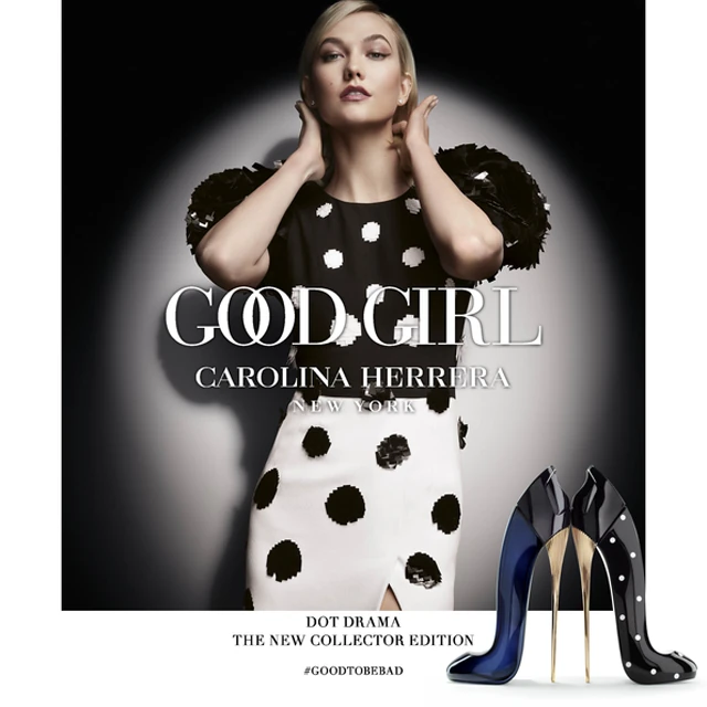 Az új Good Girl Dot Drama Eau de Parfum a 2016-ban nagy sikerrel debütált Good Girl okos, bátor, rejtélyes és ellenállhatatlan oldalát mutatja meg és egyben új fejezetet nyit a Good Girl sikertörténetében. Az új kiadást a bohókás pöttyös (polka dot) minta inspirálta. A fekete-fehér pöttyös minta a Carolina Herrera márka korai éveiben meghatározó designelem volt. Az illat arca változatlanul Karlie Kloss modell, az ő aláírása látható a tekintetet mágnesként vonzó csodaszép illatdobozon.
