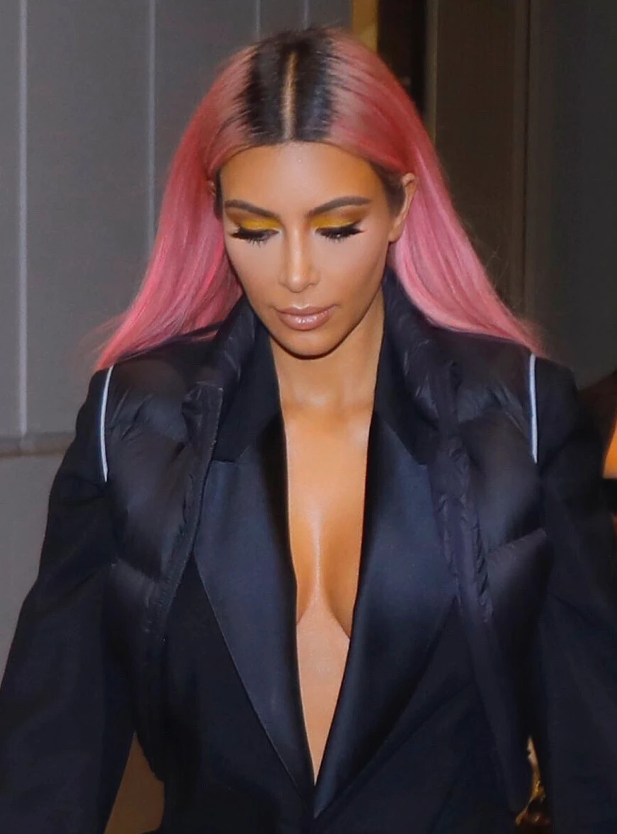 Kim Kardashian mindig is kitűnt extrém hajszíneivel és gyönyörű sminkjeivel, így ez Tokióban sem történt másképp, ahol a híresség a rózsaszín haj mellett egy erőteljes sárga szemhéjpúdert választott.