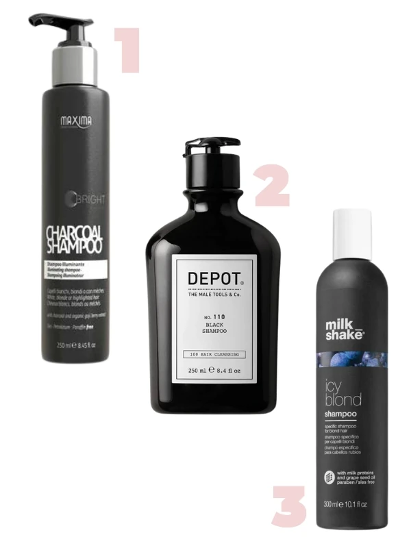 1. Charcoal hamvasító sampon aktív szénnel MAXIMA 5340 Ft / 250 ml (21,36 Ft/1 ml) 2. 100 hair cleansing no. 110 black shampoo DEPOT 8000 Ft/ 250 ml (32 Ft/ 1 ml) 3. Icy Blond Shampoo MILK_SHAKE 7480 Ft/300 ml (24,93 Ft/1 ml)
