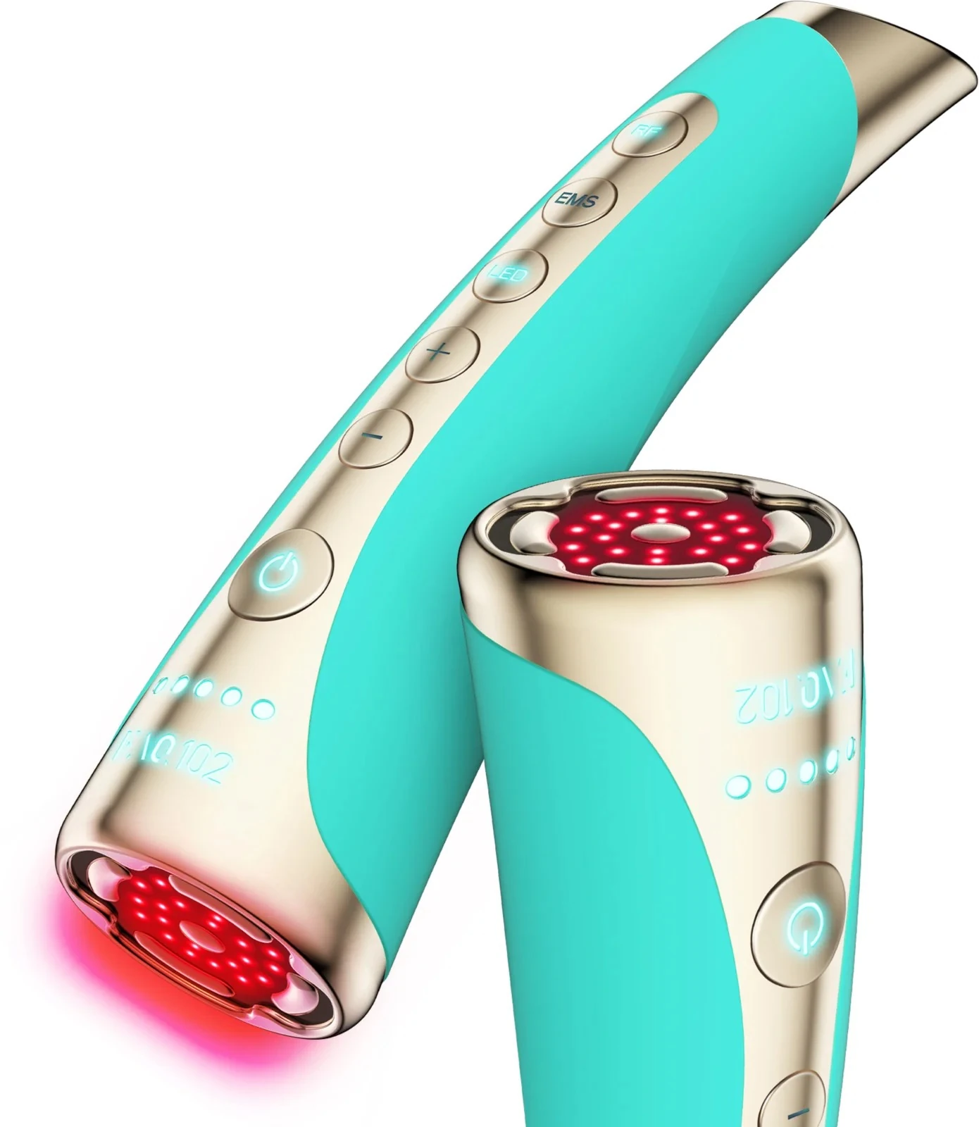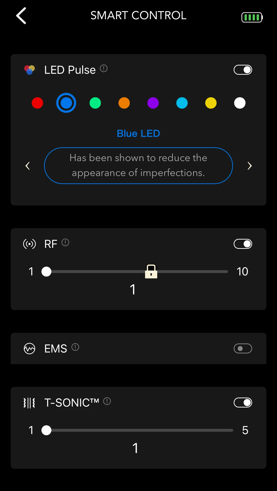 A készülék bekapcsolása után az 'RF' gombbal tudod aktiválni a rádiófrekvenciát, az 'EMS' gombbal az elektromos izomstimulálást indítod el. A plusz és mínusz gombokkal az intenzitást növelheted vagy csökkentheted, attól függően, mennyire intenzív hatást szeretnél elérni: a bekapcsoló gomb alatti fénysor jelzi az erősséget. A 'LED' gomb megnyomásával a LED-es fényterápiát kapcsolod be - nyolc féle LED fényből válogathatsz, amit a gomb ismételt megnyomása változtat. A T-Sonic pulzálás beállítása az applikáción keresztül érhető el. A kezelés közben fontos, hogy a kezelőfelületen lévő 5 aranylemez hozzáérjen a bőrhöz.