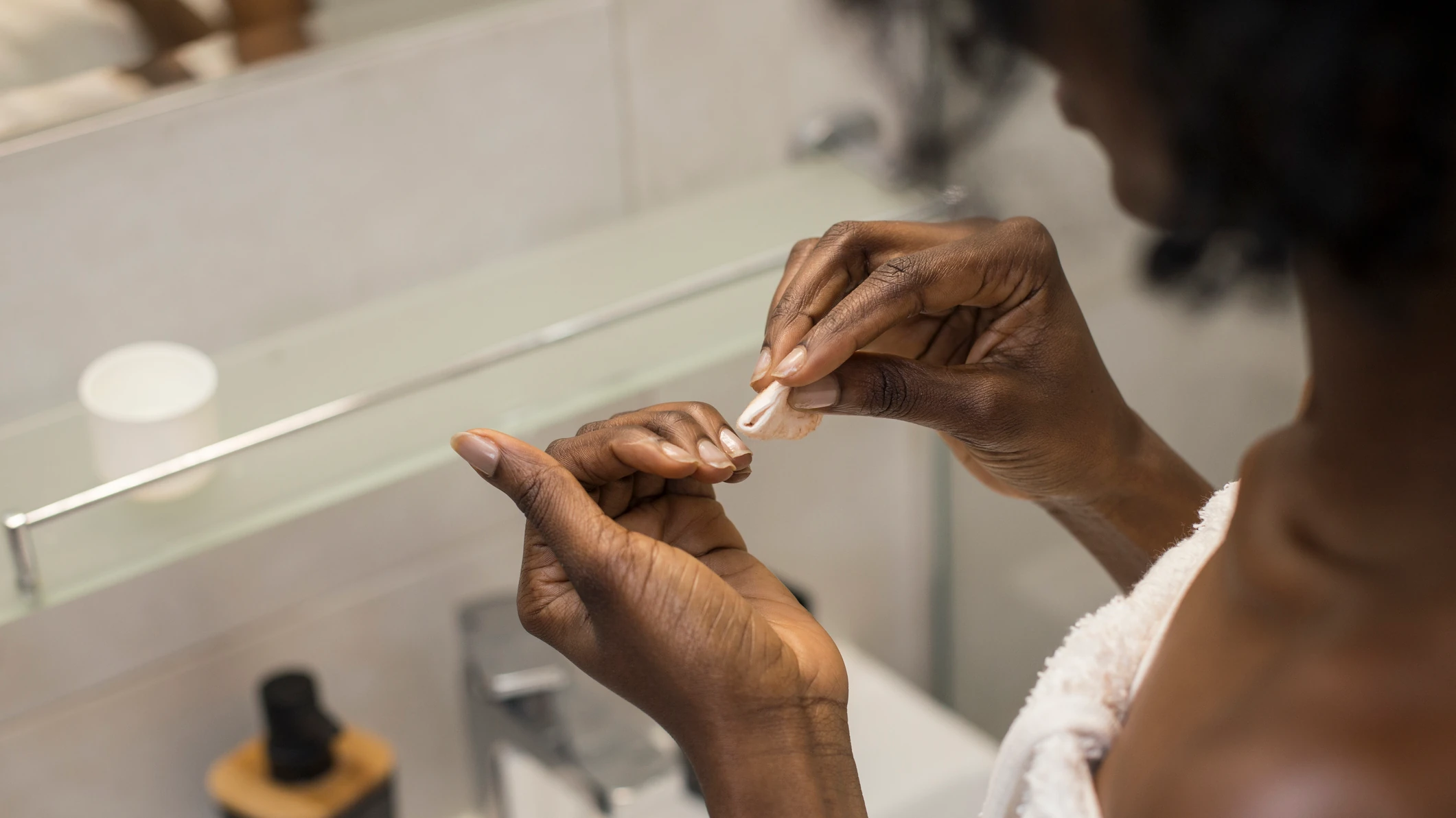Mielőtt a lakkot oldó szert alkalmaznád a körmödön, érdemes egy réteg vazelint felvinni a kutikula és a körmöt körülvevő bőr területére, hogy védjen az oldószer szárító hatásától. A géllakkot acetonos körömlakklemosóval távolíthatod el. Tíz apró vattadarabra és tíz alufóliacsíkra lesz szükséged. A vattadarabokat mártsd bele az acetonba, majd helyezd a darabkákat a csiszolt körmeidre és rögzítsd őket az alufóliacsíkokkal. Ha mind a tíz körmöddel elkészültél, hagyd így állni őket 10-15 percig.