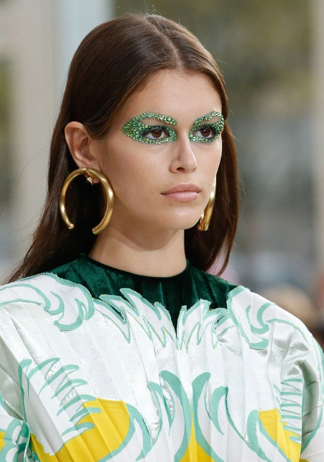A fiatal modellnek tényleg minden jól áll, ugyanis most egy elég extrém sminket kapott, de még ez is tökéletesen festett rajta. Kaia szemét körbe zöld csillám borította és arany karika fülbevalóval vonult végig a kifutón.