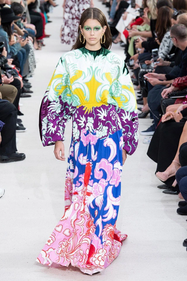 A díszes smink mellé egy színes maxiruhát kapott a lány, ami szuperül állt neki annak ellenére, hogy sok extrém szett a divatbemutatókon előnytelen a modellek számára.
