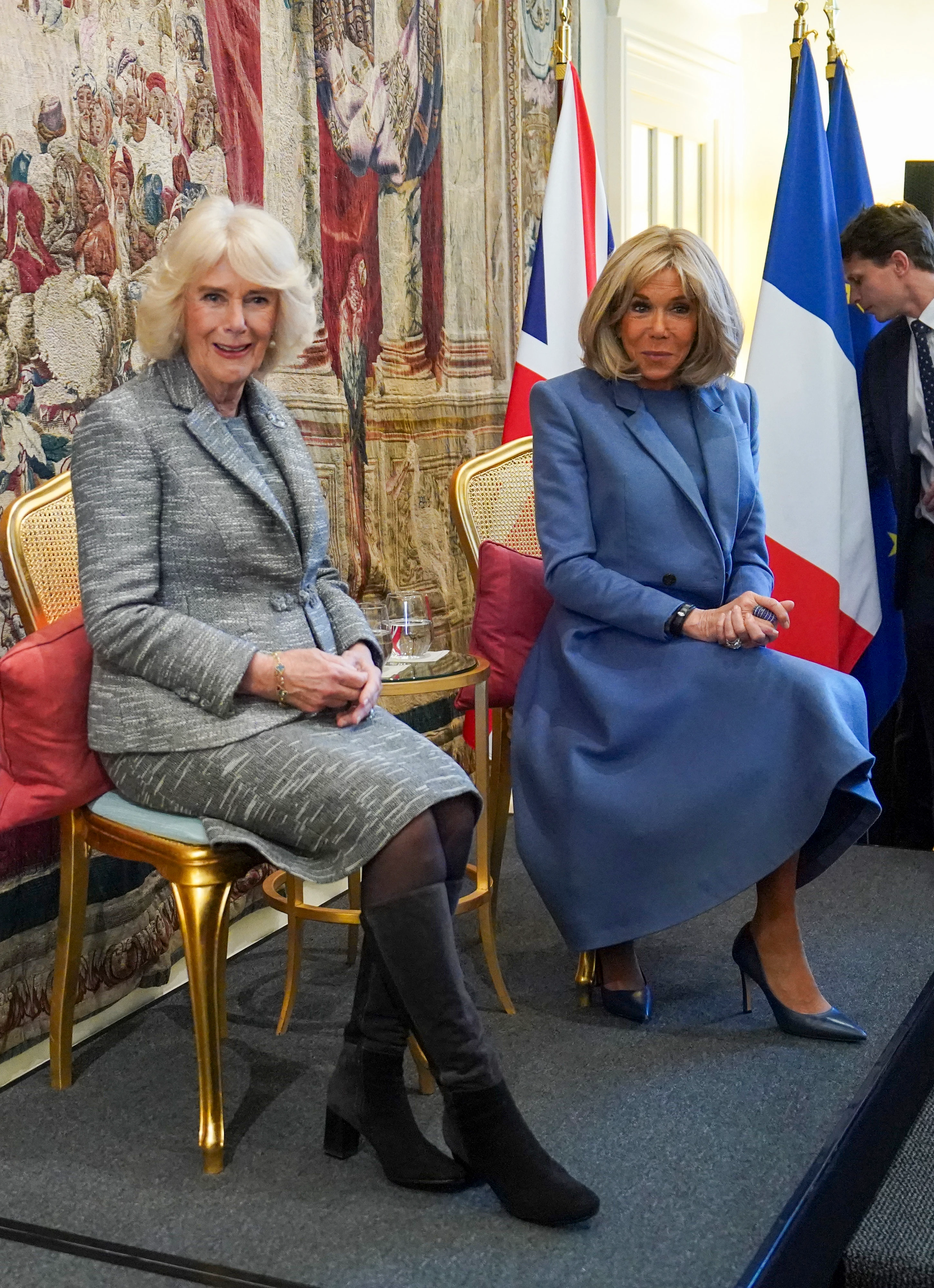 A királyné mellett a francia elnök felesége, Brigitte Macron is kifinomult stílusával nyűgözte le a jelenlévőket: királykék kabátruhája tökéletesen ellensúlyozta Kamilla királyné ruhájának visszafogott árnyalatait. A két nő közötti szimpátia még a képeken keresztül is tapintható, csak úgy árad belőlük a harmónia, amely nemcsak az öltözködésükben, de a találkozó hangulatát tekintve is bebizonyosodott.