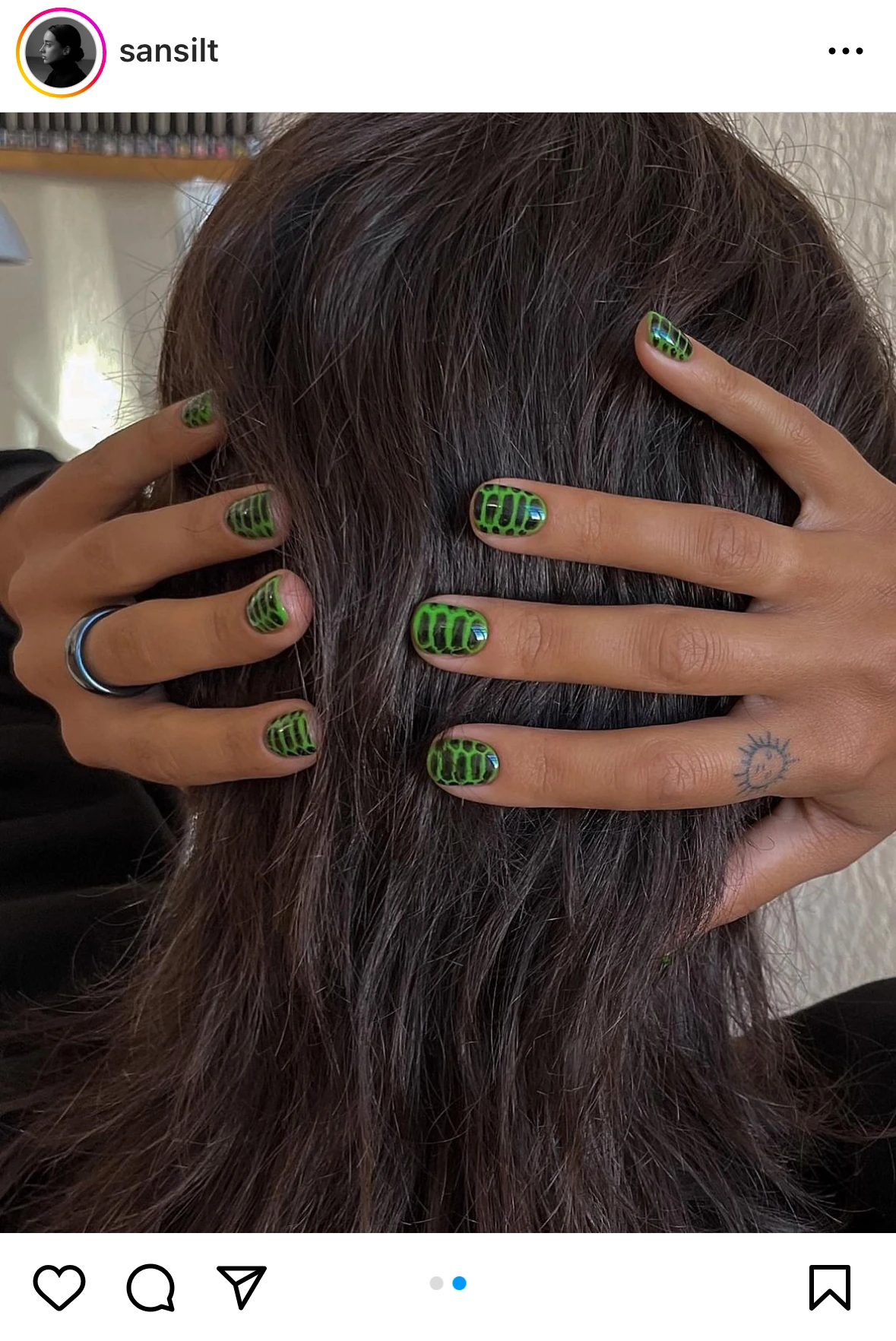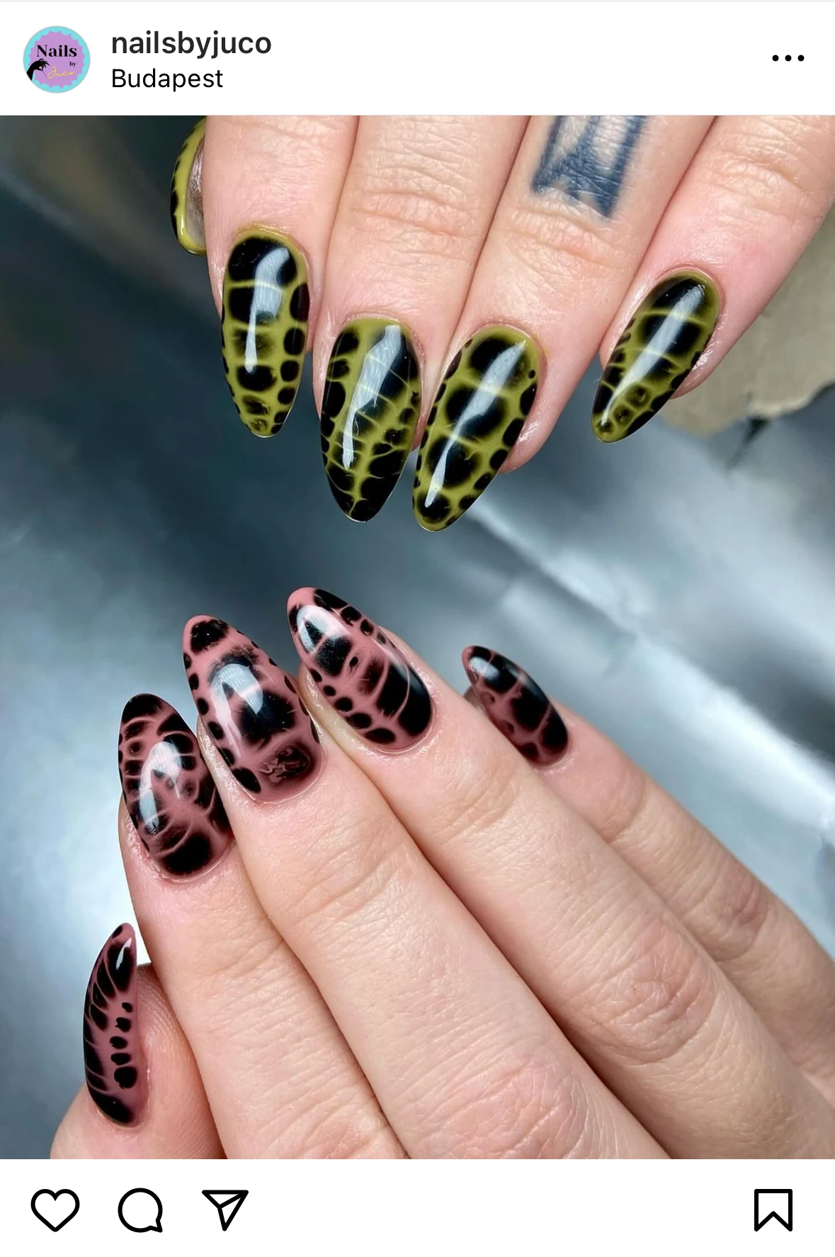 „Gyakran megihlet egy festmény vagy művészeti alkotás látványa, de alkalmanként használom a különféle közösségi média vagy képmegosztó felületeket is. Sokszor előfordul velem, hogy a szabad perceimben eszembe jut egy jó összeállítás ötlete és elmentem a jegyzeteim közé, amit később aztán meg is valósítunk egy vendéggel.” A krokodilkörmök nem véletlenül ennyire felkapottak, hiszen a vagány mintázat szinte bármilyen színből kihozható, de a klasszikus változatát a zöld és barna árnyalatok mutatják meg legjobban.