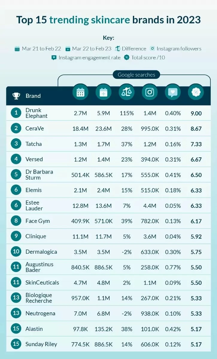 Az eladási listák élén világszerte a Drunk Elephant áll, ami elkötelezte magát a biokompatibilis bőrápolás mellett, és kizárólag természetes anyagokat használ a bőr egészséges megőrzése érdekében. A márkára irányuló keresések több mint 114 százalékkal nőttek 2021/22 és 2022/23 között, ami azt mutatja, hogy a márka iránti érdeklődés egyre nagyobb. Az Instagram oldalukon jelenleg több mint 1,5 millió követőjük van.