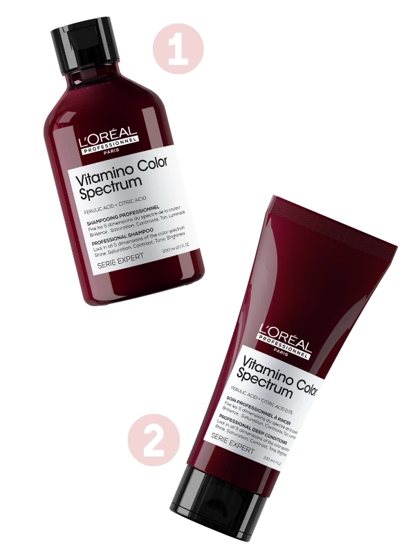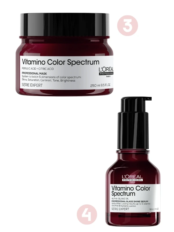 A professzionális színvédelem és a ragyogó, selymes haj legújabb innovációja a ferulinsavval és 2,5% citromsavval gazdagított termékekben rejlik, amelyek bizonyított hatékonysággal őrzik meg a festett haj legszebb állapotát.** A Vitamino Color Spectrum termékek a színspektrum mind az öt dimenziójára hatással vannak: tükörfényű ragyogást, intenzív telítettséget, optimális kontrasztot, semlegesített árnyalatokat, és tartós élénkséget biztosítanak.