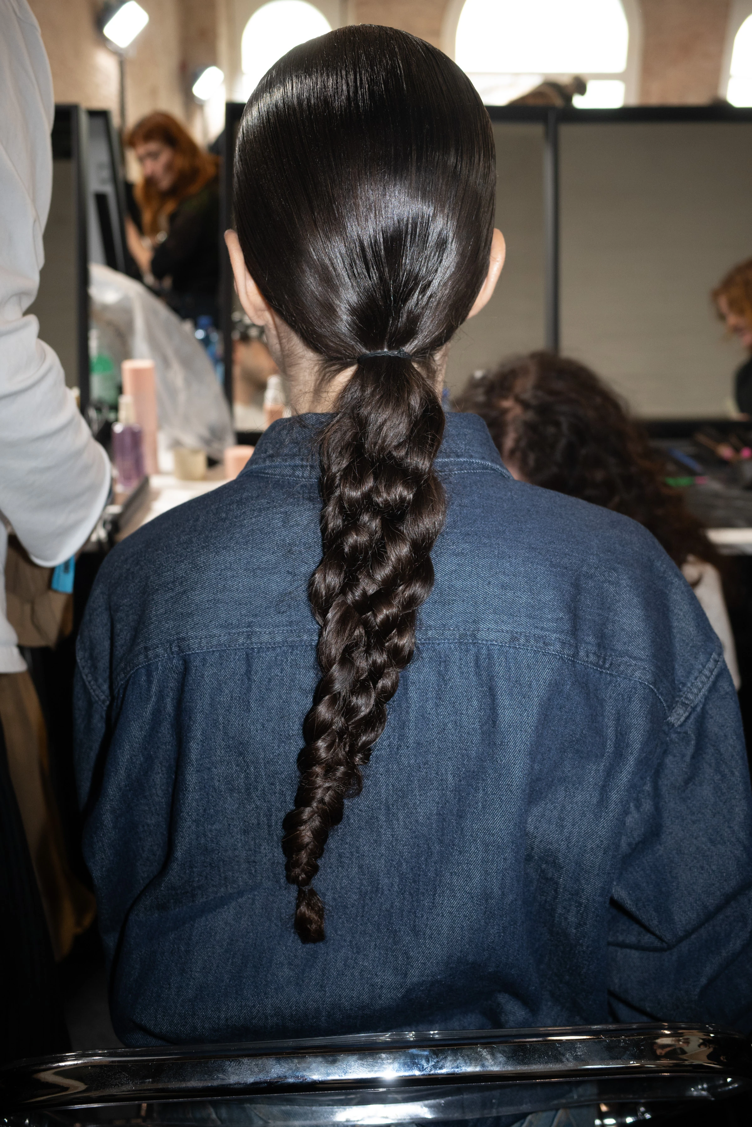 Ezzel szemben a Giada által bemutatott szettekhez - melyek a tisztaságot, a precizitást és a finom érzékiséget képviselik, valamint lágy sziluettek, szoborszerű vállmegoldások és visszafogottságot jelenítenek meg - tervezett hajviselet a 90-es évek minimalizmusának modern újraértelmezése volt. A hajhosszt középmagasságban összefogták és egy laza kontyba tűzték, amelyből egy finom hajtincs bukkant elő - ez a visszafogott részlet egyensúlyozta ki a fegyelmet a légiességgel.
