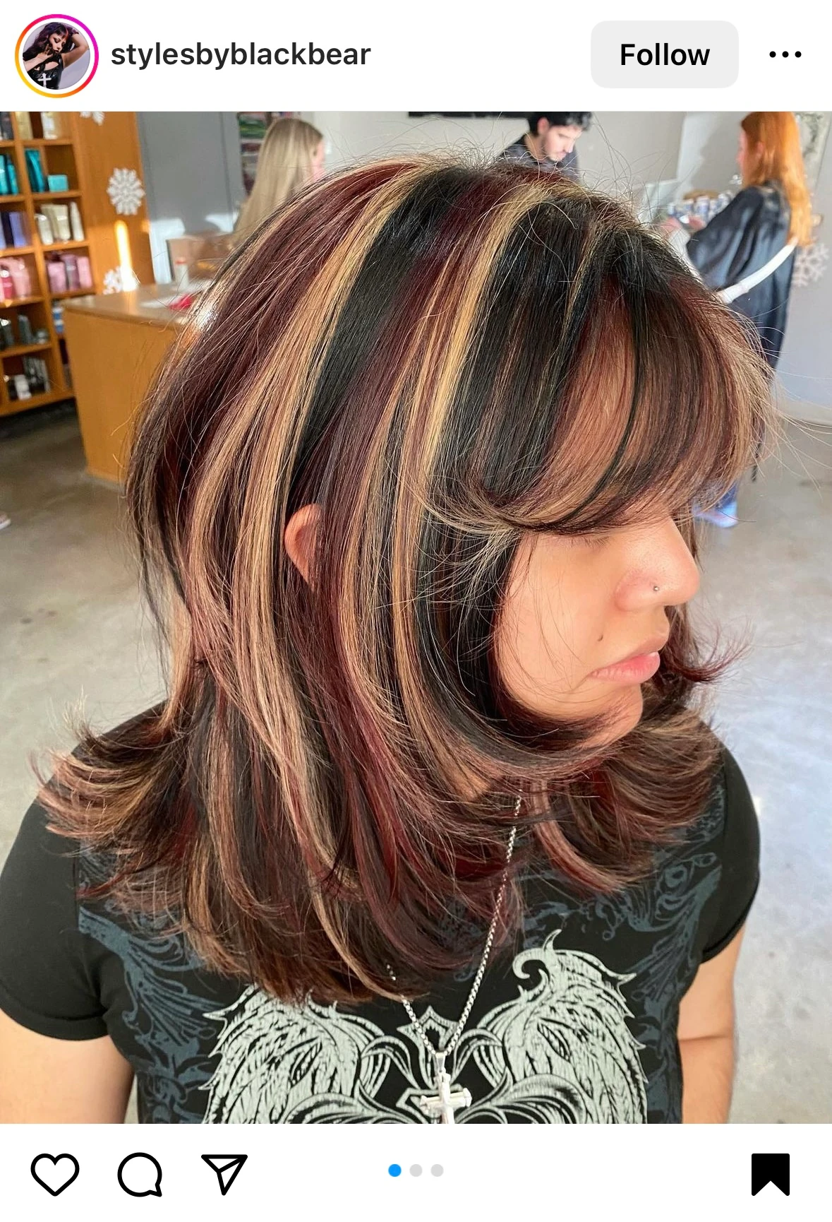 Az egyik képen úgy tűnik, mintha csak meleg, 2000-es évekbeli vöröset viselne, egy másik képen azonban határozottabb highlightokat láthatunk átsejleni a felső tincsek alól, a frufrujában és az arca körül. Ahelyett, hogy látványos kontrasztra törekedett volna, az egyes árnyalatokat sokkal közelebb hozta egymáshoz: a tűzpiros szépen, puhán borostyánbarnába hajlik, a fekete helyett, pedig egy középárnyalatú karamellbarnát választott, és a szőke esetében, egy meleg mézszínnel teremtett lágy összhangot.