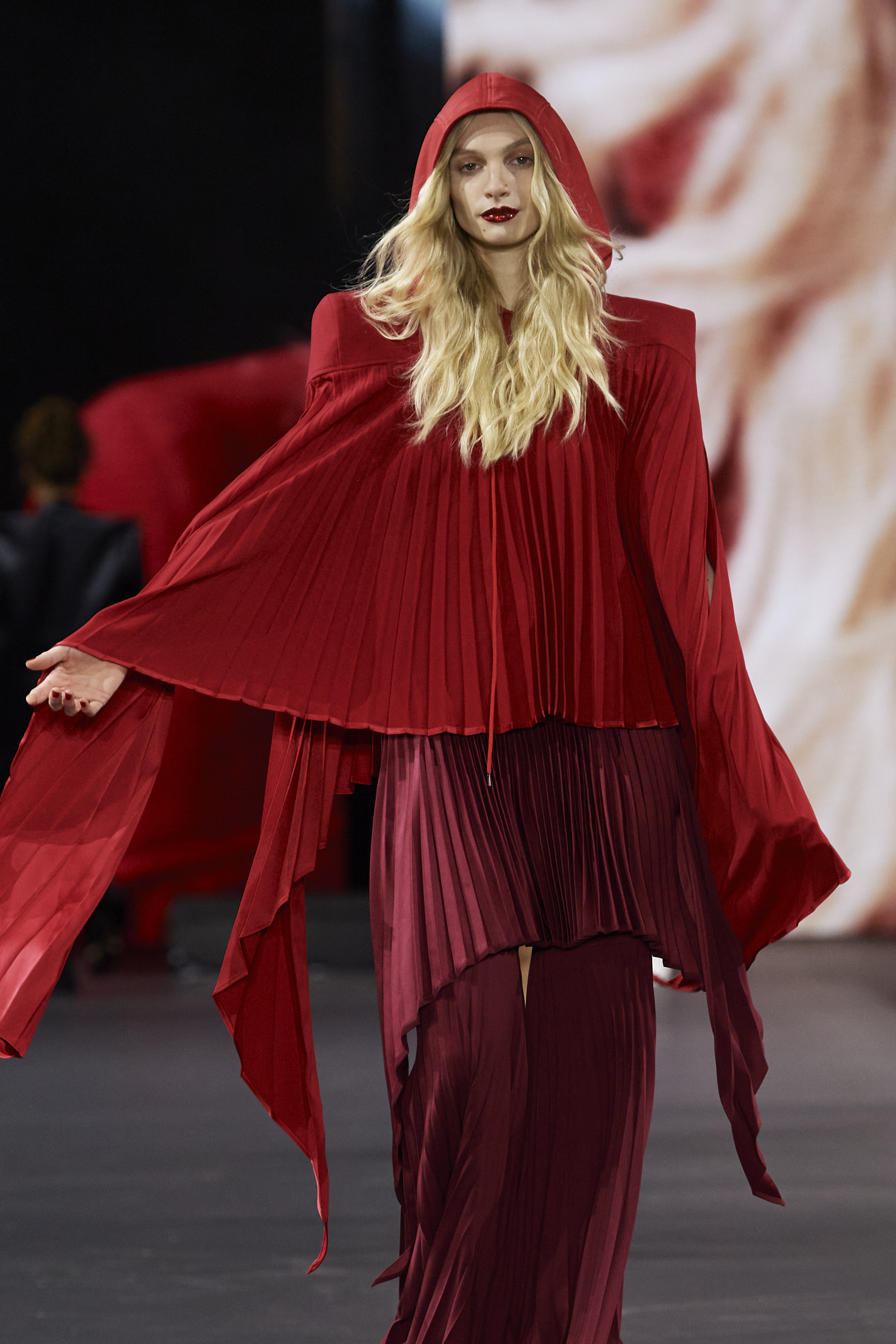 Stella Maxwell középen elválasztott, összefogott szőke haját remekül kiegészíti a hideg, élénkvörös szájszín.