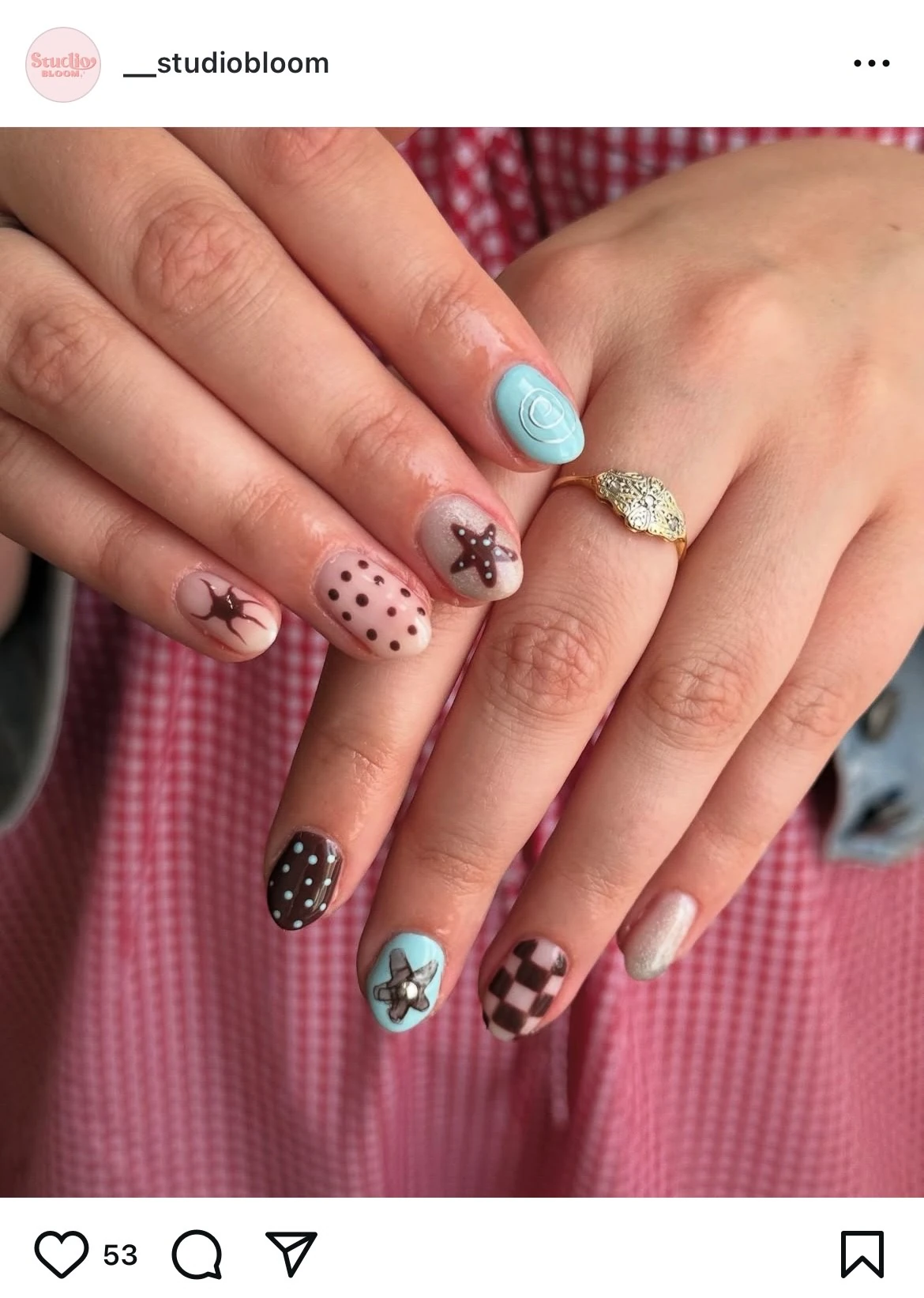 Néha nem elégszünk meg csupán egy mintával, és ezzel az ég világon semmi baj nincs. Akár nyaralásra is választhatunk olyan dizájnt, amiben minden körmünkre valami extrát teszünk. A pöttyös tökéletesen működik kis csillagokkal, de akár kockás díszítéssel is.