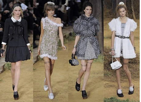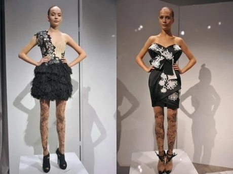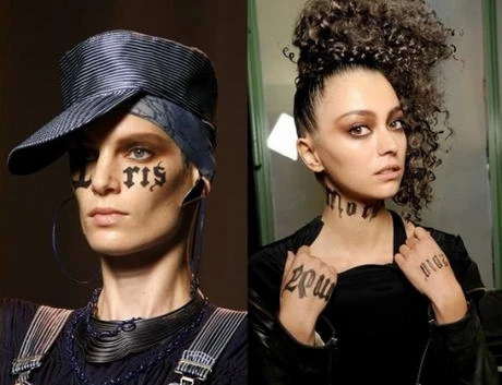 A vékonyka modellek nyakára, arcára, mellkasára neveket, szövegeket írtak, de sajnos gótikus betűtípus olvasásban nem vagyok jó (nekem sokszor a graffitik is csak hablatynak tűnnek). Szemüveggel is megnéztem. A lényeg: Gaultier a vidám ruháit nagyon hatásosan tette erőteljessé ezekkel az apró vonásokkal. Cool!