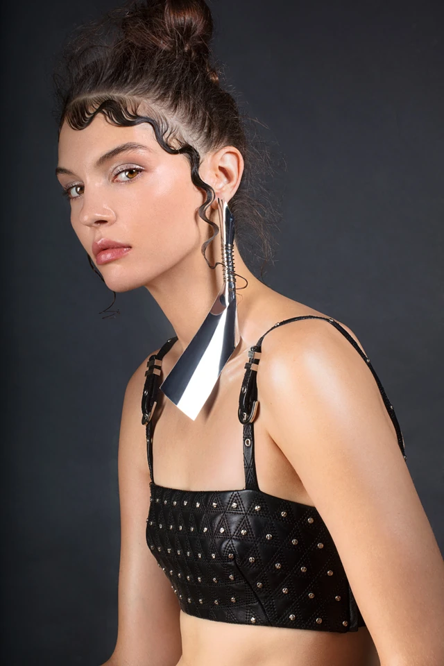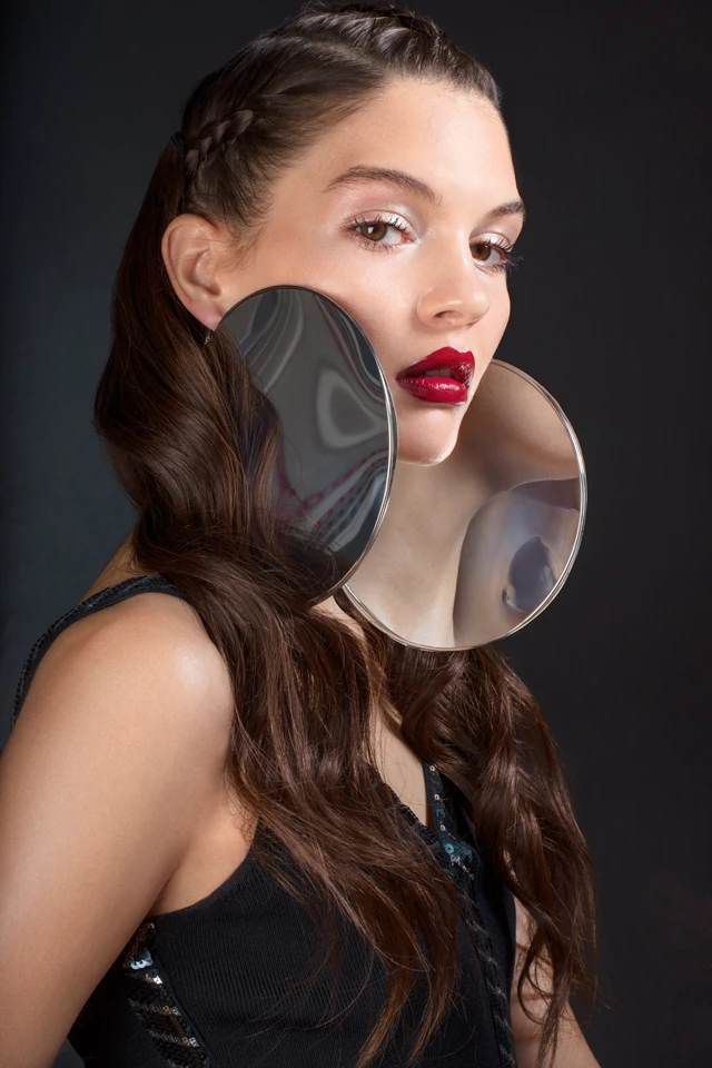 Egy lazán felfogott hajban nincsenek korlátok. Akár még a babahajak is szabadon szállnak. Bolondítsd meg egy sűrű, lezselézett hullámmal, ami aztán lokniban végződik. A természetes, fényes hatású smink tökéletes harmóniában van az erőteljes, szegecses bőrfelsővel.