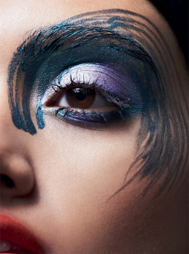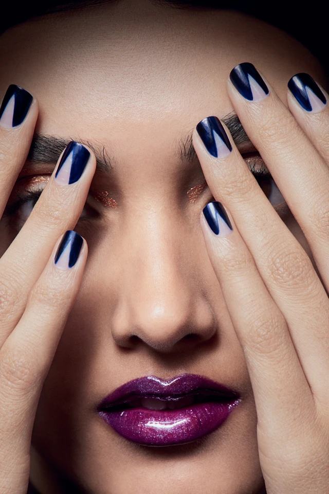 "Bármilyen sötét ajakszín szóba jöhet télre!" – mondta Garland. Ezt a gyönyörű csillogó lila szájat egy csapott arany metál tusvonallal párosította (L'oreal Paris Infallible Eye Paints Mettalic in Rose Chroma, lorealparisusa.com). Még annál is menőbb élénk-grafikus körmökkel együtt, mint ez a V-alakú, melyet Trish Lomax manikűrmester készített nekünk. Próbáld ki hozzá a YSL LA Lauque Couture in N. 17 Bleu Cobalt körömlakkját a körmök teljes lefedésére (ylsbeautyus.com).
