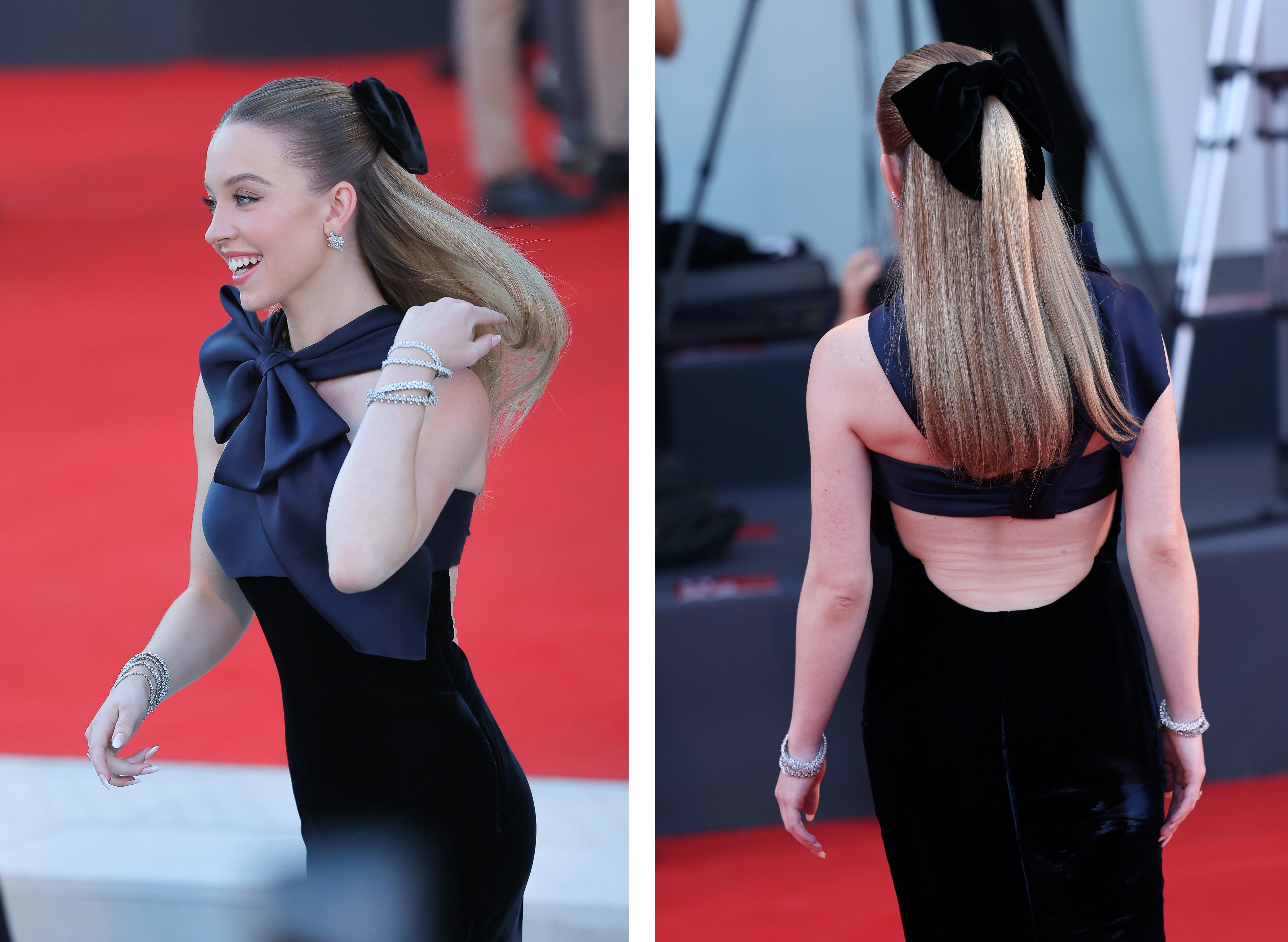 A következő sztár, akinek a hajában szintén fekete masnit láthattunk az Sydney Sweeney volt a Bones and All premierjén. Az Eufória sztárja egy hihetetlenül elegáns fekete, masnis Armani ruhában jelent meg a vörös szőnyegen, a sikkesen félig feltűzött hajában pedig tökéletes kiegészítő volt a nagy, fekete bársonymasni.