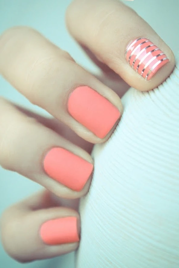 A fémesen ragyogó körömdíszítésből sosem elég! Fess türkiz vagy barack színű alapot, majd válassz arany vagy ezüst körömdíszeket, hogy még inkább feltűnővé varázsold a dizájnt. Ha éppen nincs kéznél körömmatricád, nyugodtan kísérletezhetsz alufóliával is!