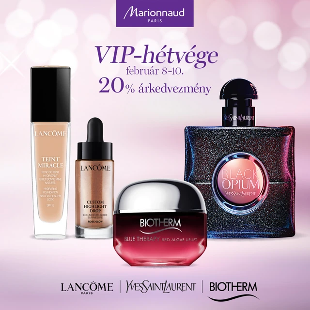 Látogass el a luxusmárkák VIP-hétvégéjére február 8 és 10. között a Marionnaud Parfümériákba, vegyél részt smink- és bőrápolási tanácsadáson és exkluzív meglepetés programokon a Westend, Mammut és Árkád üzletekben, és vásárold meg a Lancôme, Yves Saint Laurent, Biotherm, Ralph Lauren, Diesel és Cacharel márkák termékeit 20%-os kedvezményes áron!