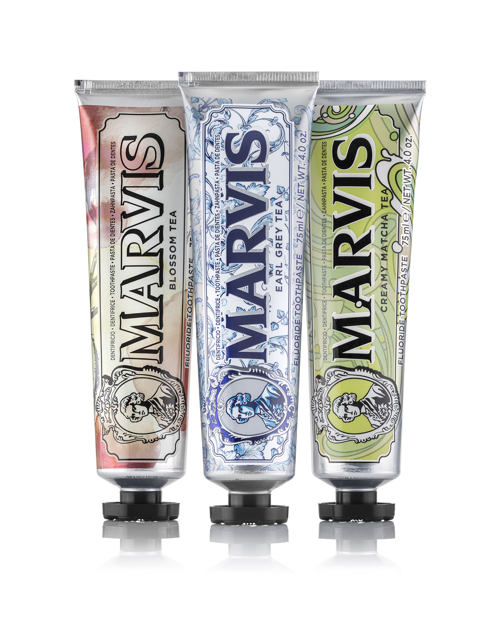 Reggeleid most még élvezetesebbek lehetnek a limitált kiadású Marvis Tea Collection fogkrémjeivel. A szettben megtalálod az Earl Grey-t, amely a fekete tea elegáns ízét a bergamottal és a gyengéden frissítő mentával keveri, a Creamy Matcha-t, amely a matcha tea frissítő ízét egy leheletnyi mentával ötvözi a hosszan tartó frissesség érdekében, valamint a Blossom teafogrémet, amelyben a virágos tea a cseresznye- és őszibarackvirág kifinomult aromájával és friss mentával egészül ki.