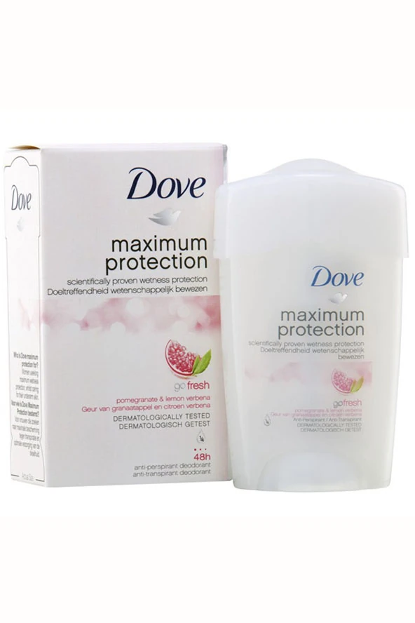 Próbáld ki az új, Dove Maximum Protection Pomegranate & Verbena krém dezodort, amely a TRIsolidTM technológiának köszönhetően maximális izzadás elleni védelmet nyújt, miközben az egynegyed rész hidratáló összetevőnek köszönhetően ápolja a bőrt. A Dove Maximum Protection izzadásgátló krém dezodor kétszer erősebb* izzadás elleni védelmet biztosít. Mikrokapszulái segítenek felvenni a harcot a testszag ellen.