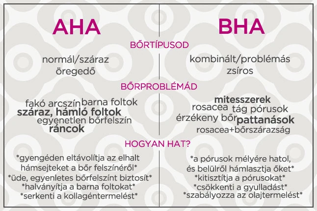 A kémiai hámlasztóknak két fő típusa van: az egyik az AHA (Alpha Hidroxy Acid, például glikolsav és tejsav), a másik a BHA (vagy másképp Beta Hidroxy Acid, közismert nevén szalicilsav). Bár mindkettő ámulatos hatású, van néhány alapvető különbség köztük. Kövesd az ábrát, és kiderül, Neked melyiket érdemes használnod.