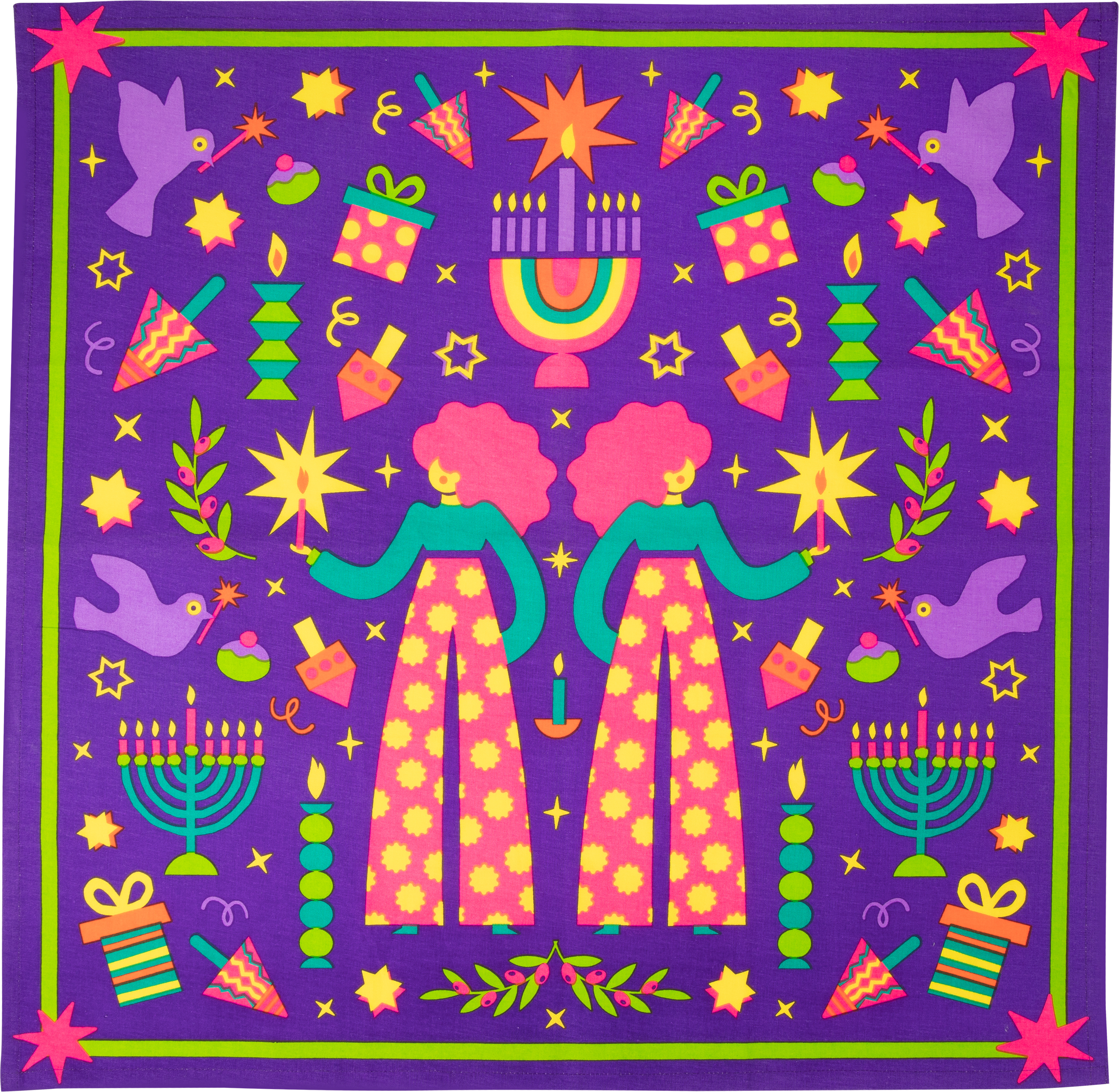 A kendő dizájnját a hanuka ünnepéhez fűződő kedves emlékeim ihlették, abból az időből, amikor a lányaim kicsik voltak. Imádtak segíteni meggyújtani a gyertyákat és kibontani az ajándékaikat minden este. A fény a remény jelképe, amely átvezet minket a sötétségen. Az otthonunk fényét és mindezt a meleg érzést akartam szimbolizálni, amit ajándékbontás közben mindig megéltem. Úgy érzem, a színek és illusztrációk felidézik ezt a melegséget, és hogy a dizájn minden eleme visszaadja a szívmelengető, ünnepi hangulatot.” – mesélte Cheryl Epstein, tervező, a Cherbear Creative tulajdonosa, aki autodidakta módon vált illusztrátorrá és mintatervezővé.