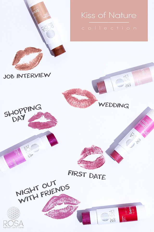 Válogass kedvedre a Kiss of Nature ajakápoló termékcsalád természetes alapanyagokból álló ajakápolói közül, a Rosa Herbal Skin Care világából!