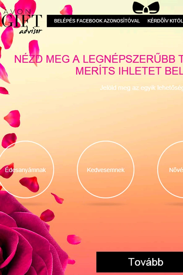 Az AVON Nőnap alkalmából különleges meglepetéssel készült! Az AVON Gift Advisor egy ajándékkereső oldal, melynek segítségével könnyen megtalálhatod a legjobb, nőknek szóló ajándékokat, hogy igazán felejthetetlenné tehesd az idei Nőnapot! Ha nincs ötleted, és szívesen inspirálódnál az AVON segítségével, az alábbi linkre kattintva megteheted ezt: AVON Gift Advisor.