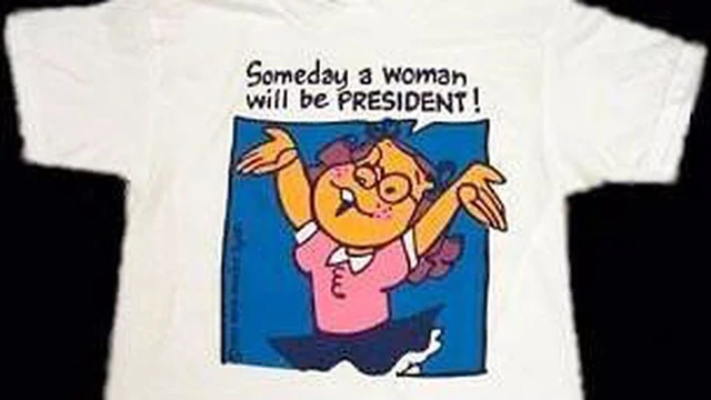 A pólón a Dennis, a komisz rajzfilmsorozat egyike karaktere, Margaret látható, és fölötte a felirat: "Egy napon talán nő lesz az elnök". Hihetetlen ma elképzelni, de 21 évvel ezelőtt ez annyira valószínűtlennek tűnt, hogy a Wal-Mart illetékesei arra hivatkozva, hogy a vásárlóik jelentős része túl agresszívnek tartja az felső üzenetét, egyszerűen betiltotta az árusítását.
