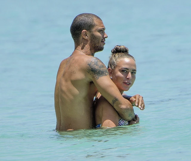 A börtönviselt férfimodell a tengerparton hesszel a milliárdos barátnőjével, míg felesége a válópert fogalmazza