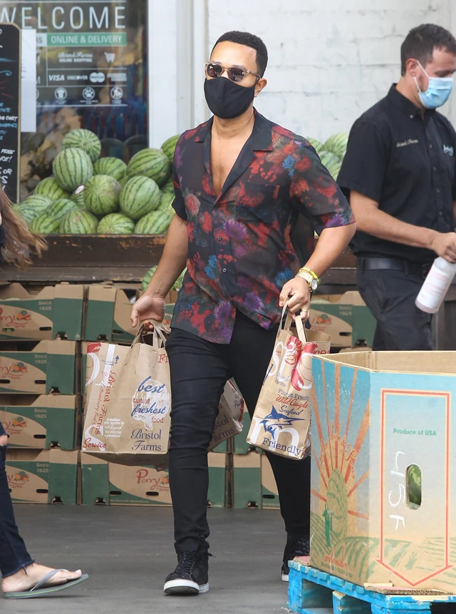 John Legendet hétfőn Los Angeles-ben kapták le a fotósok, miközben egy élelmiszerboltból távozott sok zacskóval a kezében. A 41 éves előadó nagyon menőn nézett ki: színes rövidujjú inget és fekete nadrágot viselt.