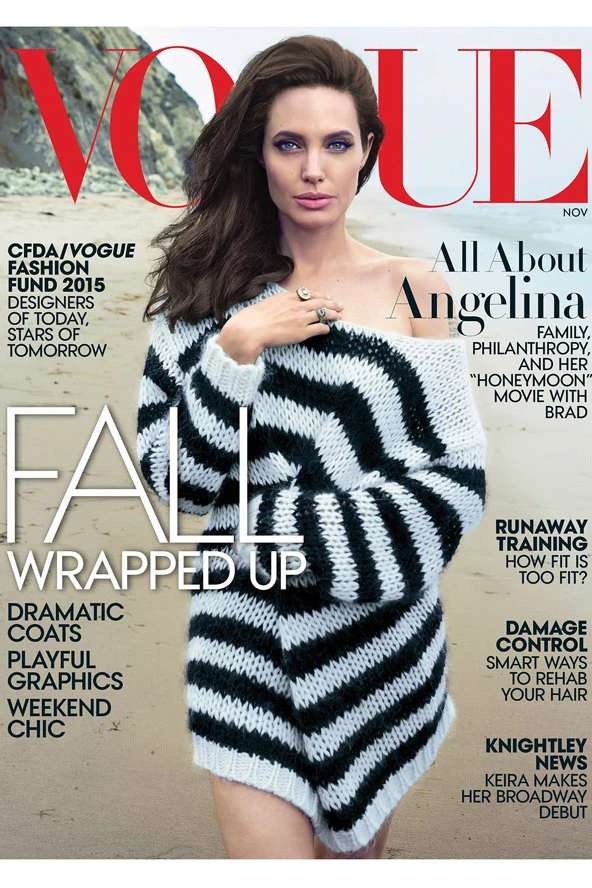 A 40 éves színésznő egy csíkos Saint Laurent pulóverben üdvözli kecsesen a novembert. Annie Leibovitz természetesen nem csak a borítóra fotózta, hanem egy egész sorozatot készített a gyönyörű színésznőről családja társaságában. A terebélyes Jolie-Pitt família mindenhova együtt utazik, ha filmet forgat a szülők valamelyike, legyen szó Afrikáról, Ázsiáról vagy Európáról, mindig együtt vannak.