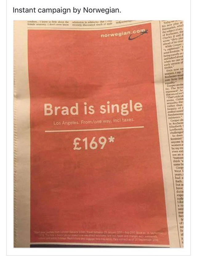 Az viszont mindenkit foglalkoztat, hogy a 450 millió dolláros válás hogyan ér majd véget. A pénzcsinálás lehetőségét azonban a szemfüles marketingguruk máris megtalálták a válásban. Bármennyire is szomorú egyébként a dolog, a norvég légitársaság most megjelent új kampánya, amelyben az amerikai járataikat népszerűsítik, mégis tényleg humoros telitalálat: