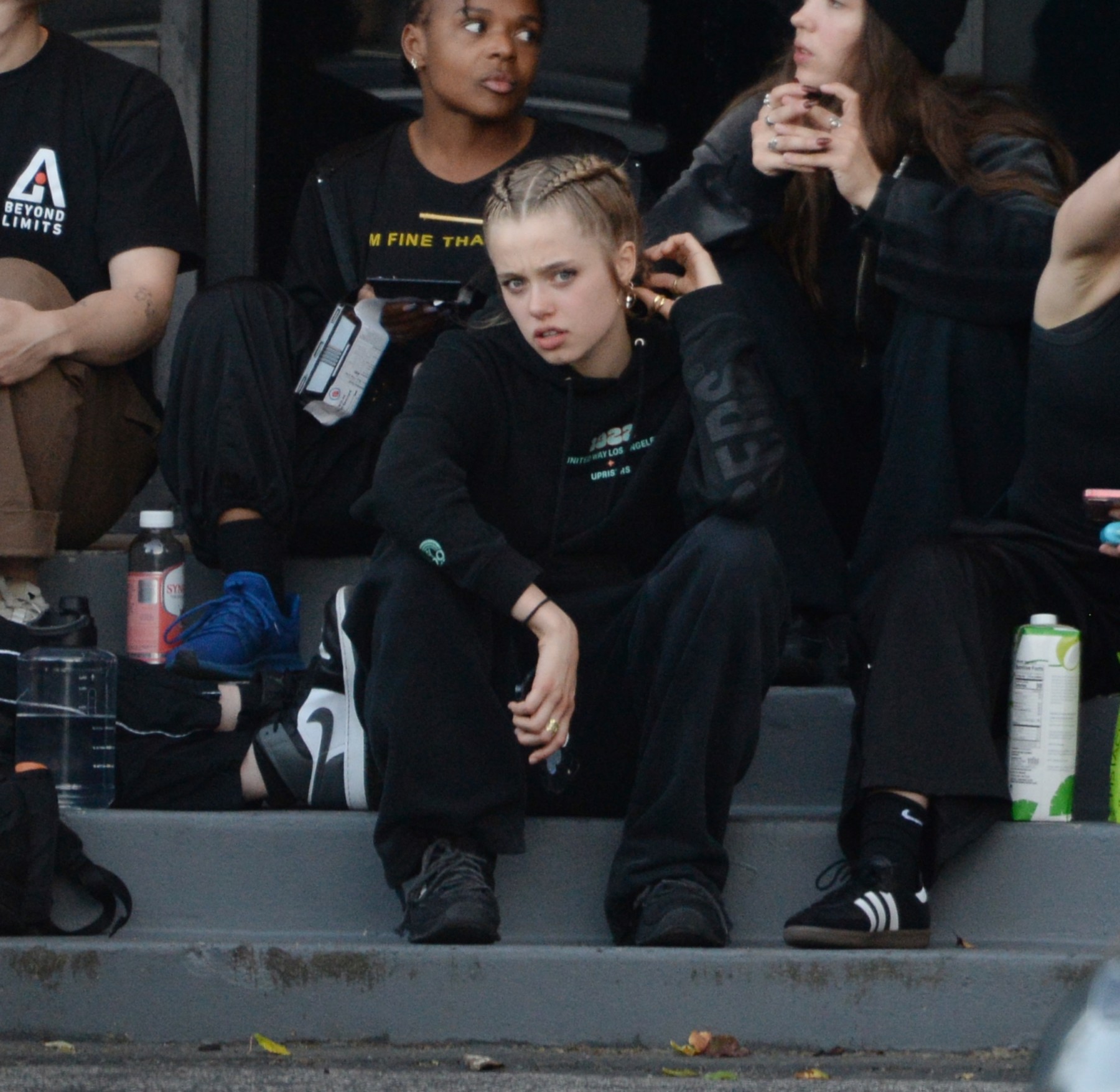Shiloh a képeken tetőtől talpig fekete, laza, sportos szettben ül a táncterem előtti lépcsőn, az outfitjét pedig arany ékszerekkel egészítette ki.